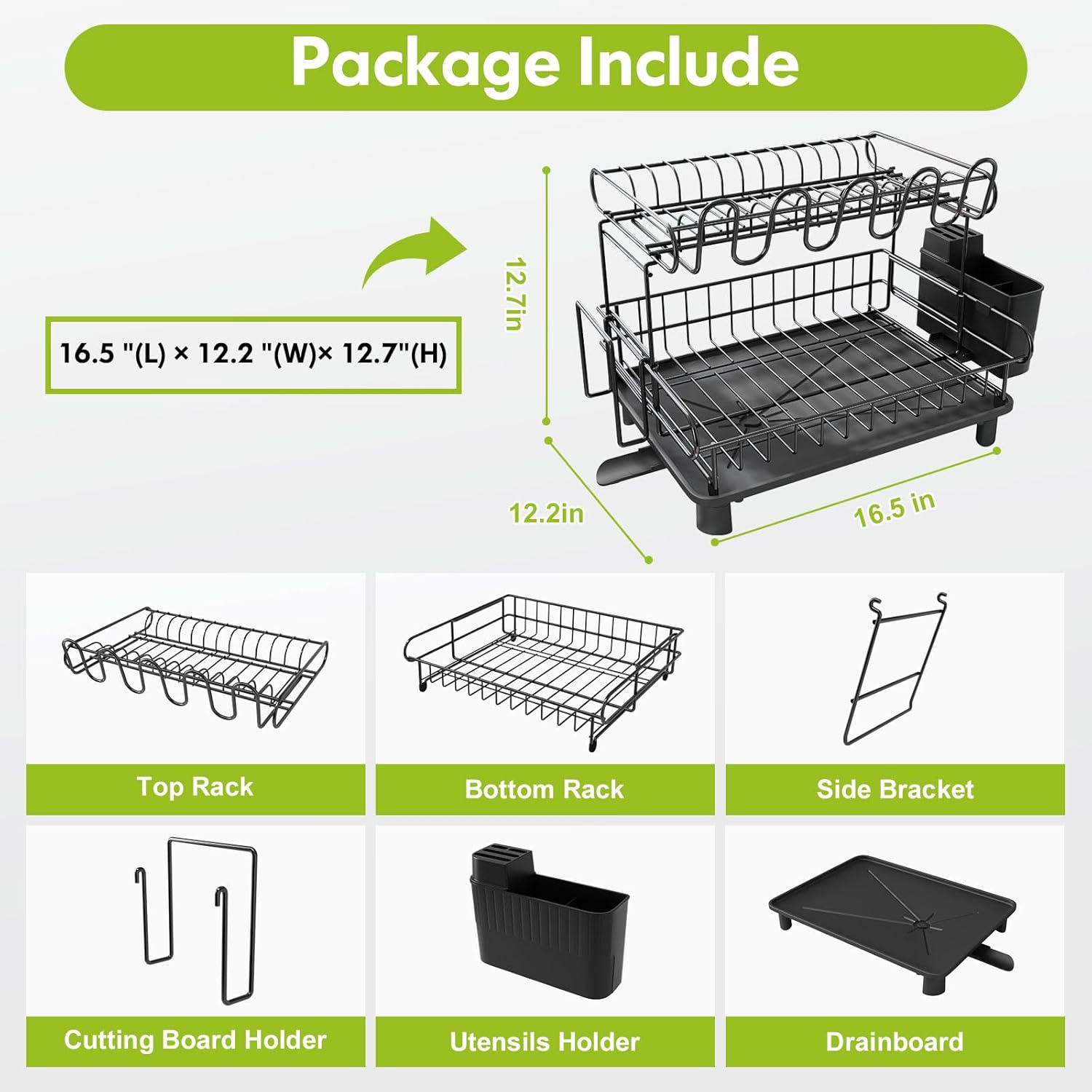 👍100% Rustproof and Super Sturdy: Our 2-tier dish rack is made of food-grade SUS304 stainless steel and can hold up to 110lbs. High strength, not deformation, environmental protection, safe and durable. With 3 layers of Nano-coating for care, say goodbye to rust, no paint falling, no fading, and corrosion resistance. The whole kitchen drying rack is smooth and anti-scratch, avoid hurting your hands or scratching the cup.