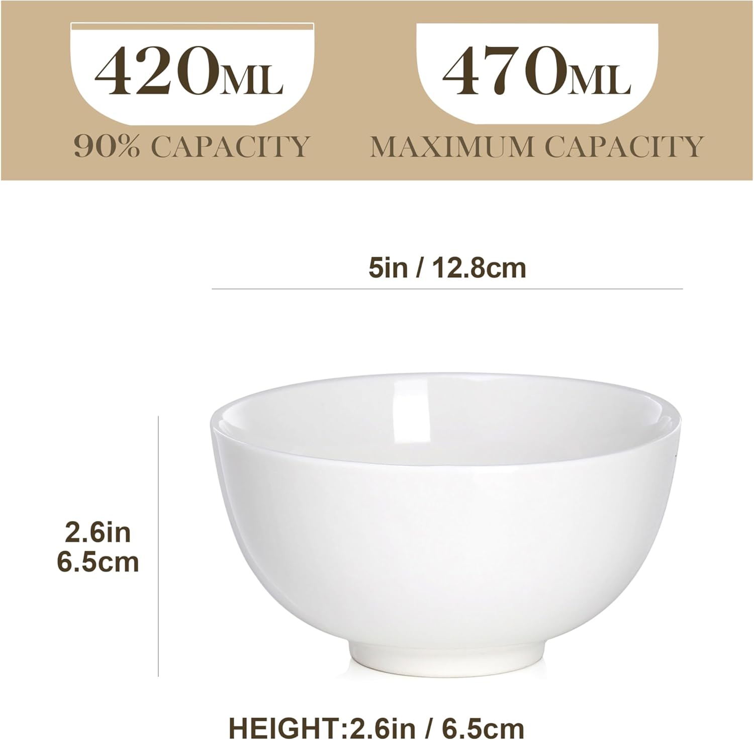 【CLASSIC DESIGN】Small Bowls Set of 8. 90% Capacity: 400-420ML. Maximum Capacity: 450ML. Dimensions (each): 12.7×6.2 cm/ 5×2.45 inch. The small bowl set impresses with its ecological design with ivory white porcelain in a round shape. The new designed ivory white tone and classic round shape design make great all-purpose restaurant style bowl, the dessert bowls not only ideal for preparing delicious muesli and fruit, but also perfect for serving rice, ice cream etc.