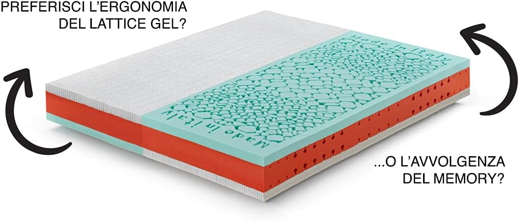 MATERIAL & CONSTRUCTION: On one side Memory foam enriched with Aloe Vera essence, regenerating thanks to its stone shape that gives a massaging effect, enveloping the body as if “caressing” it, on the other side Latex Gel density 65 Kg/m3, ideal as a comfort layer to regulate the climate in contact with the body. The double sizes have 2 single blocks with unique king-size cover to allow both partners to choose the side they want.