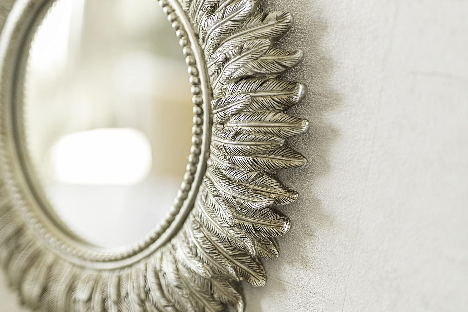 Modern round-shaped feather mirrorHard-wearing gold-painted finishCarved feathers around the edgeHassle-free and easy installation processCrafted with care and attention to detailSuitable use for bedrooms, bathrooms, hallways, and living rooms
