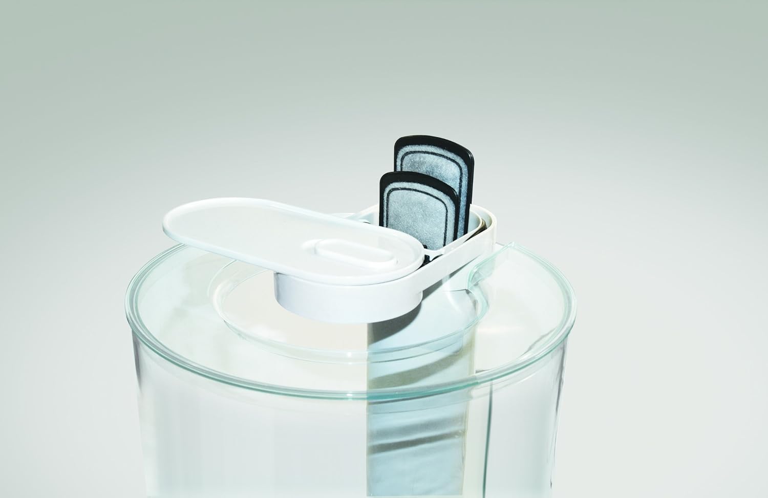 Two filter cartridges collect organic waste and provide biological filtration to keep the water healthy for fish and plants. They can be pulled out to rinse or replace.