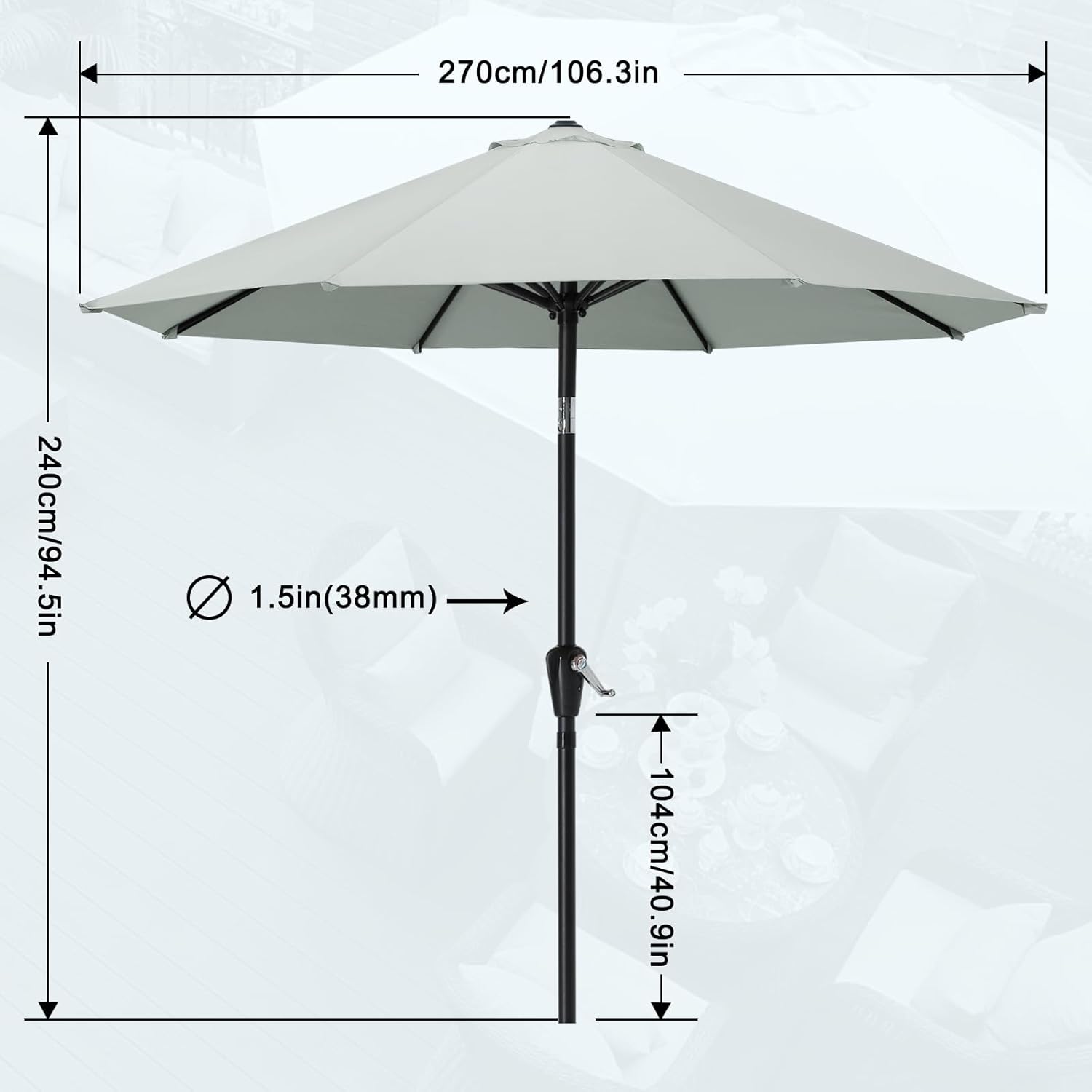 ⛱ Reasonable Design: Strong pole to match your patio table. Convenient with crank to open or close. Handy push button to tilt according to the angle of sunray to produce a large range of shade.