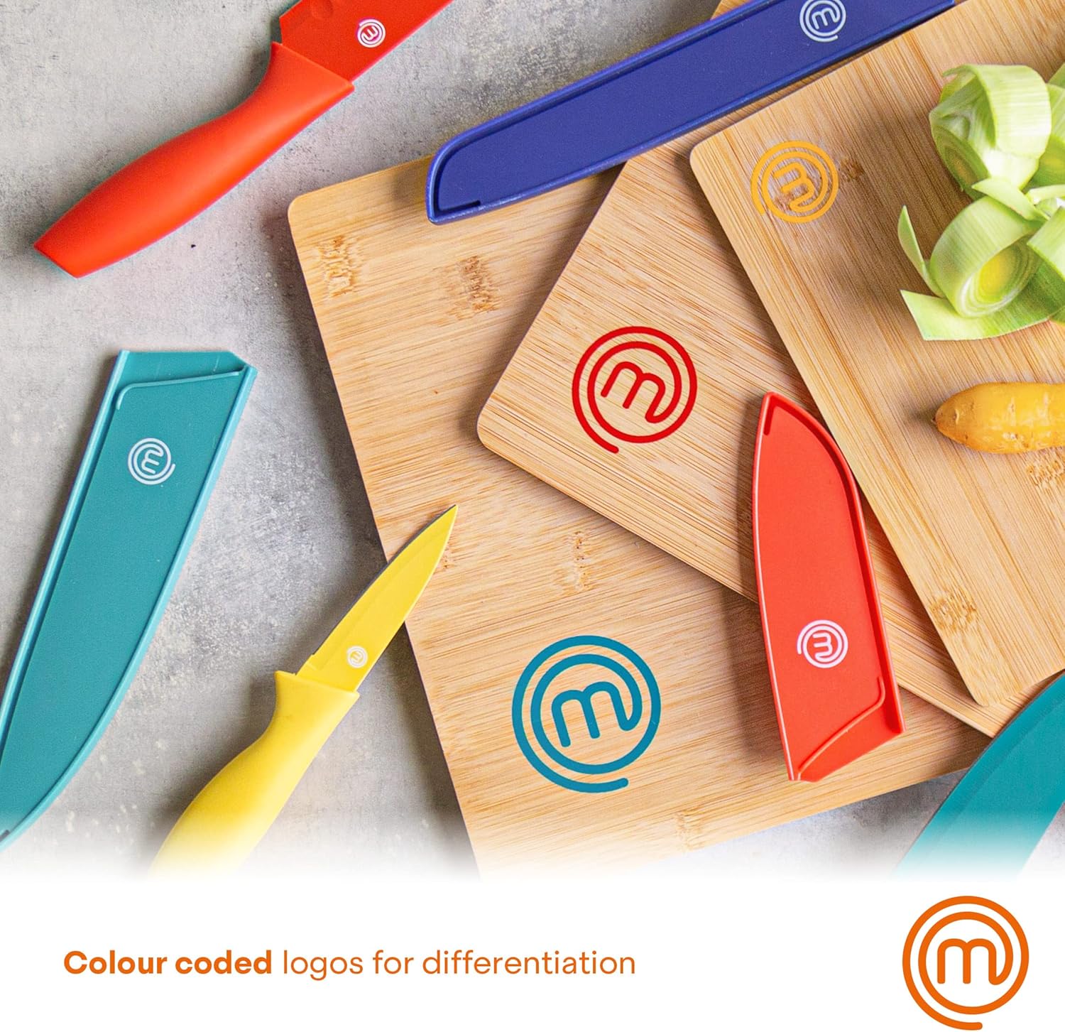 MasterChef Wooden Chopping Board Set of 3, Bamboo Cutting Boards for Kitchen, Colour Coded Chopping Boards with Coloured MasterChef Logos, Organic & Sustainable Material, Natural & Food Safe