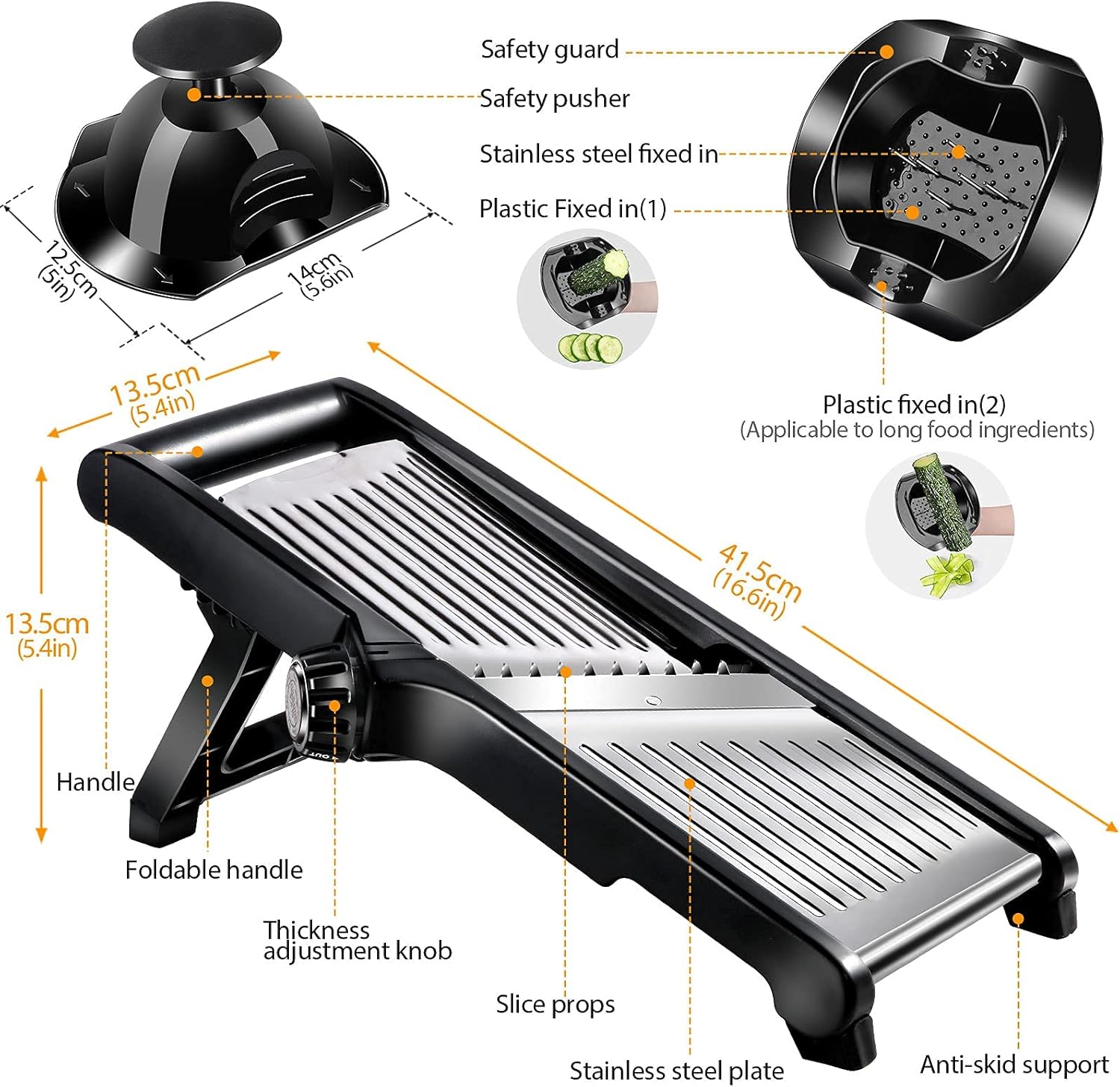Adjustable Mandoline Slicer: This mandolin slicer features sharp stainless steel blades that provide a clean and neat cut for any type of food. It offers 2 ways to cut slices or juliennes.( Adjustable from 1mm to 9mm slices, 4.5mm Julienne and 9mm Julienne.) So you can cut as you see fit to fit any type of vegetable, fruit or fries.