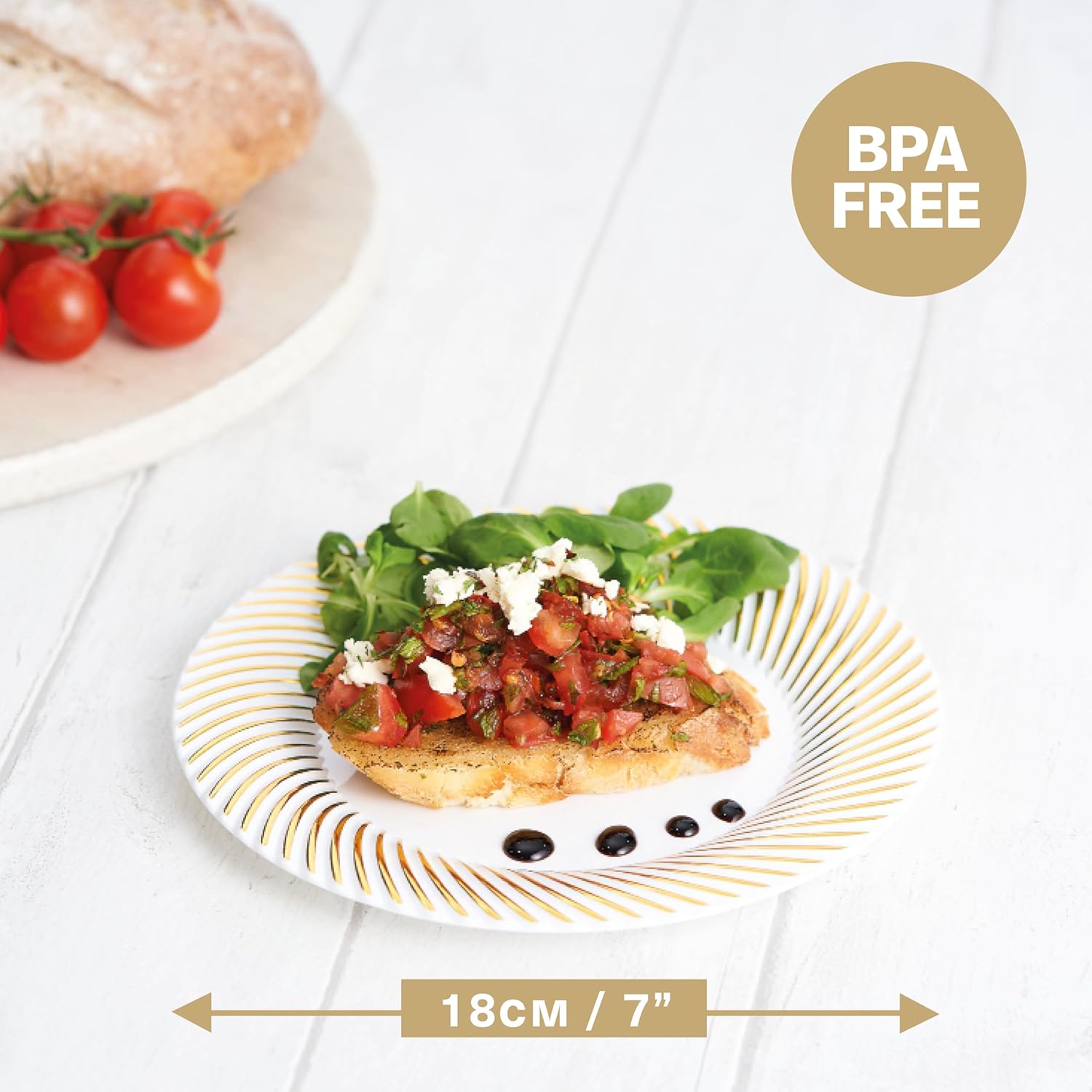 MATANA 20 Premium White Plastic Dessert Plates with Gold Rim, 18cm / 7 Inch – Elegant & Reusable Small Side Plates, Starter Plates for Weddings, Birthdays, Picnic, BBQ, Parties