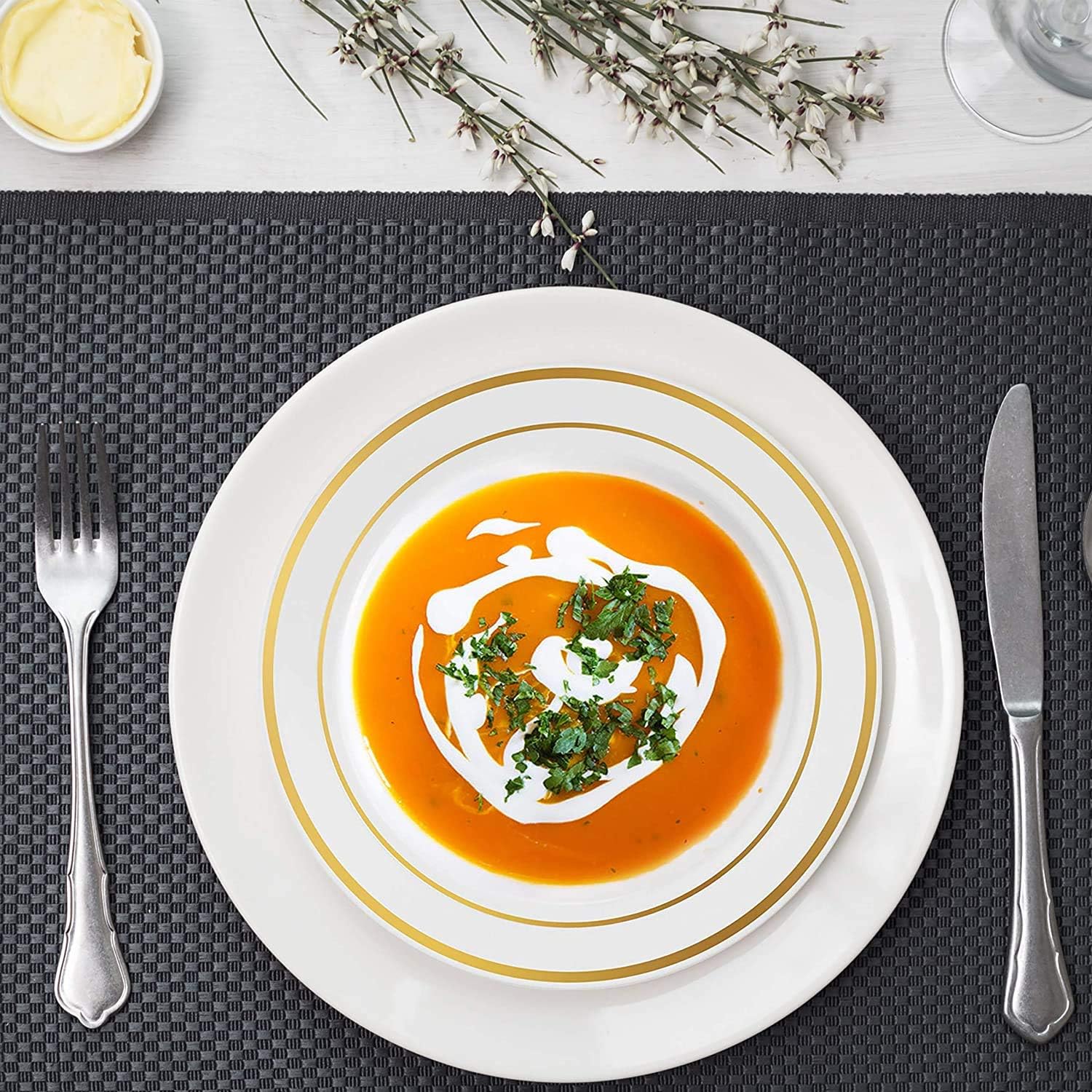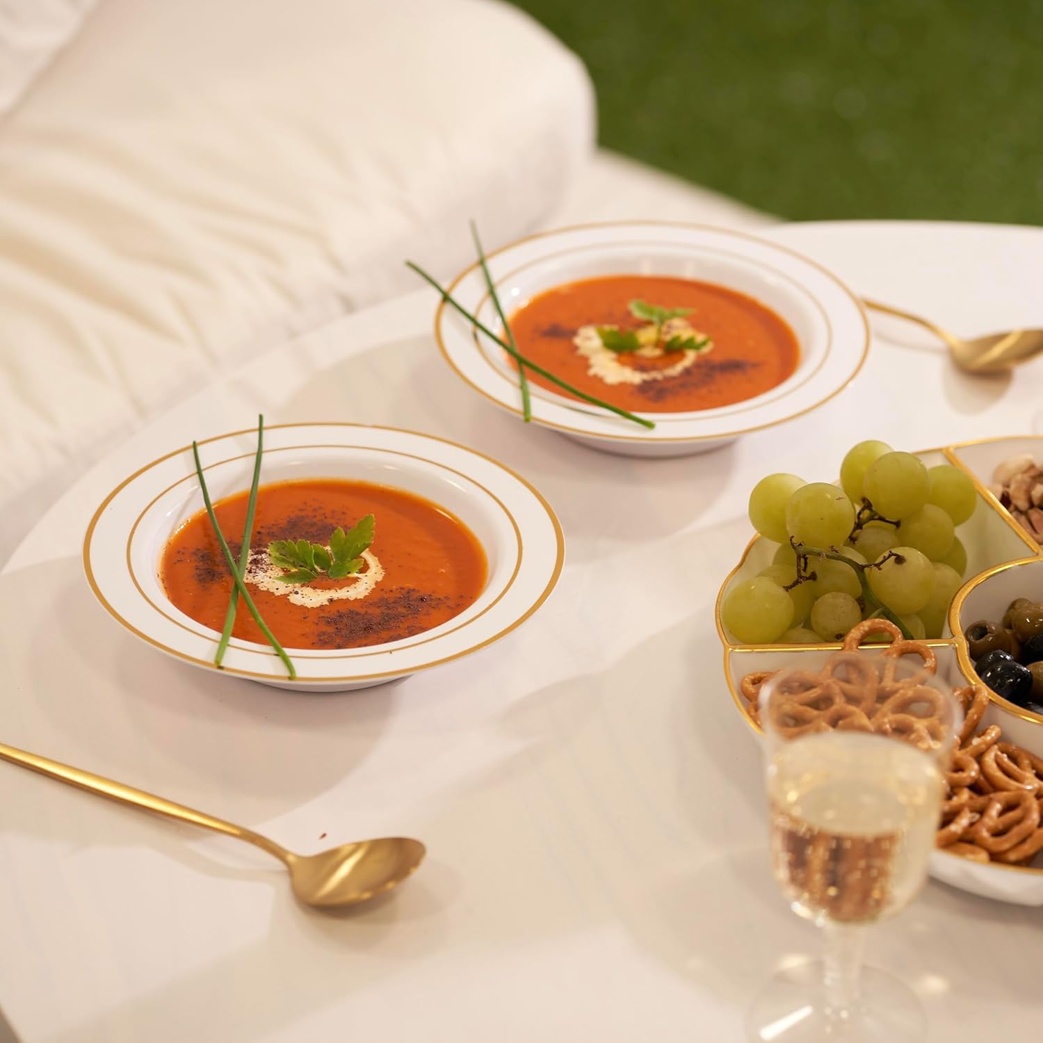 ELEGANT AND CLASSY : The gold rim on these bowls adds a touch of sophistication and class to any table setting. This elegant design makes these bowls a great choice for formal events or dinner parties, where presentation is key. The combination of the white and gold colors gives these bowls a classic and timeless look that can match any decor or theme.