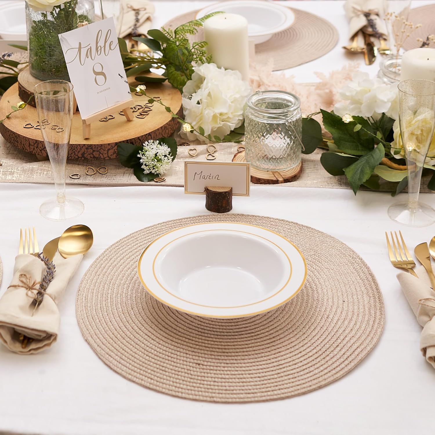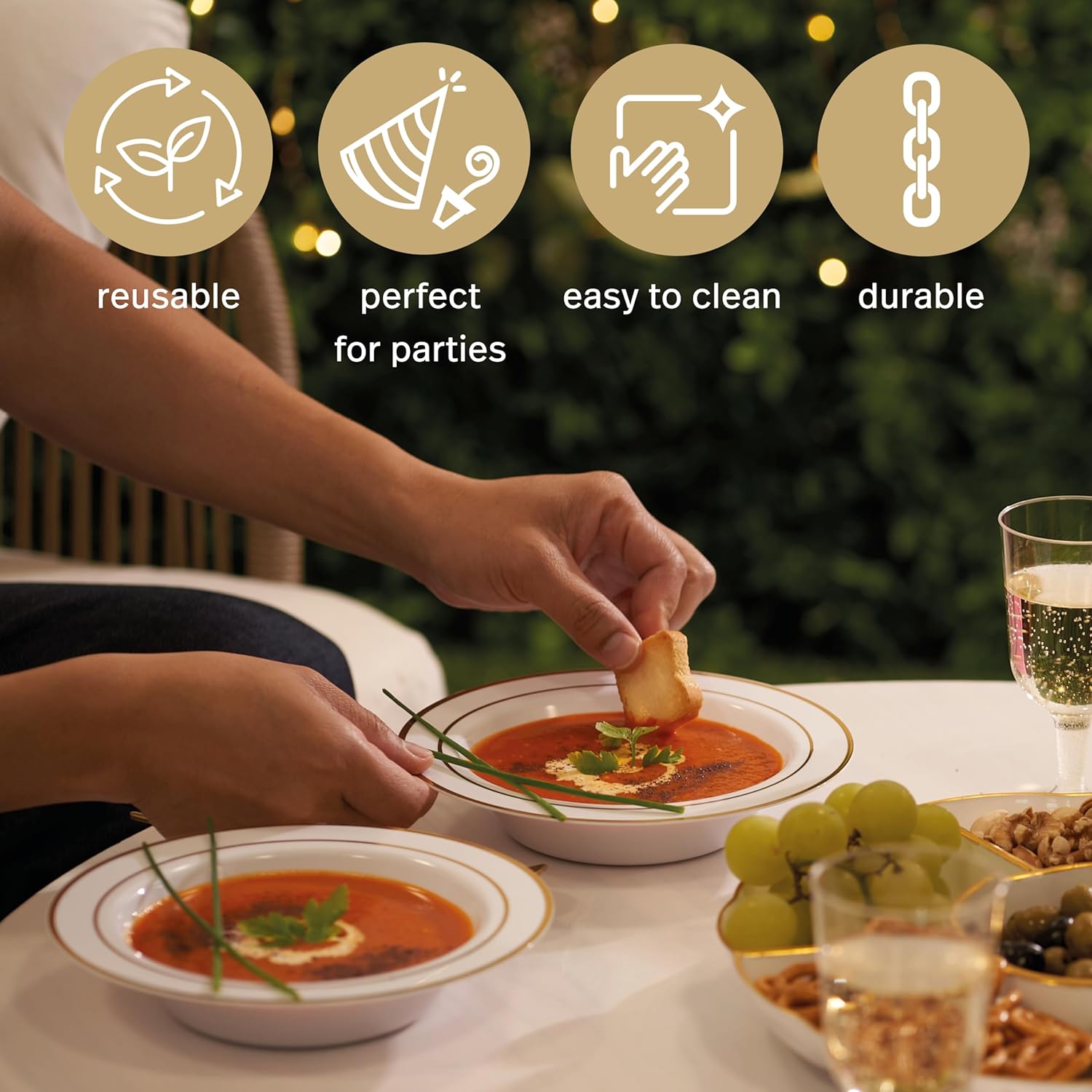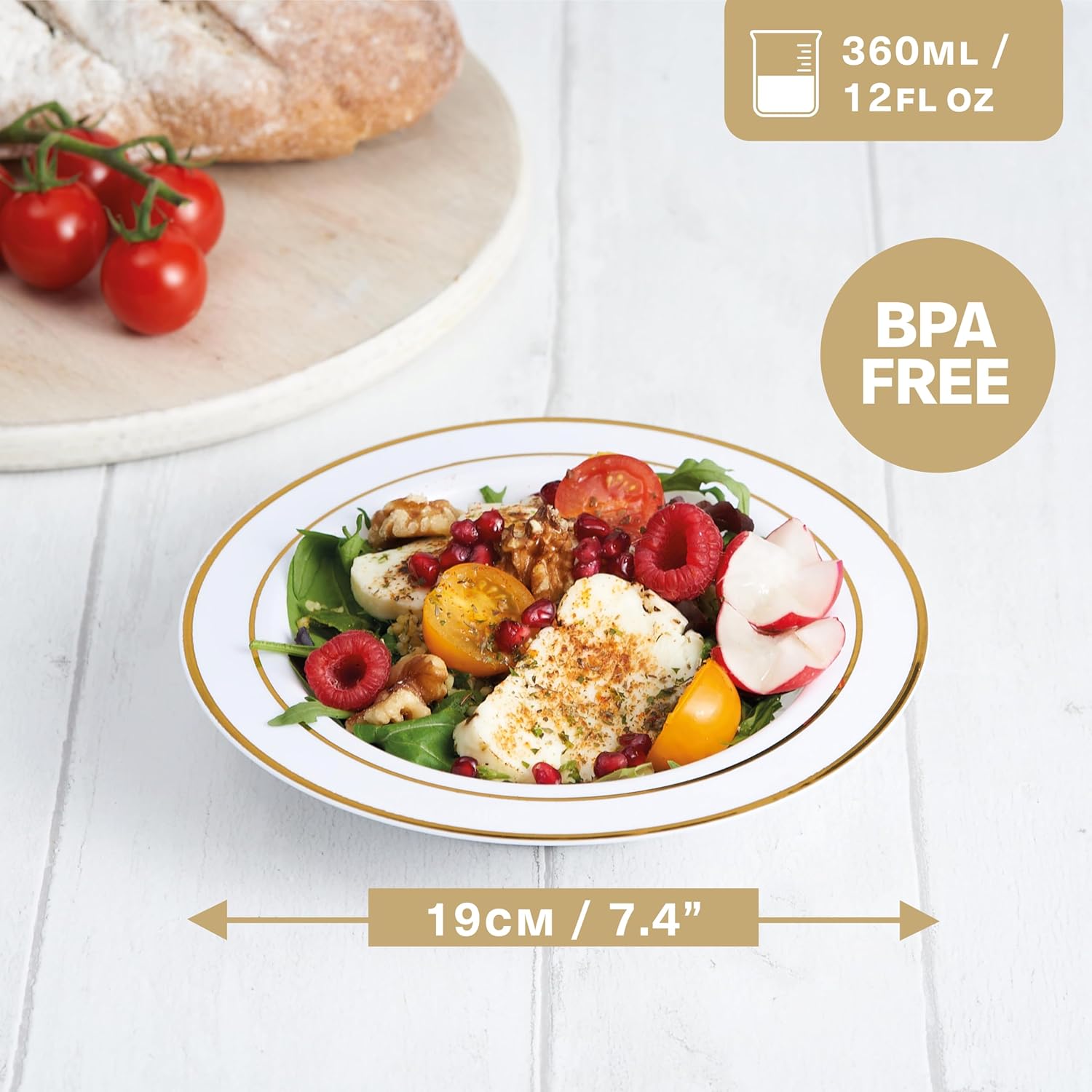 MATANA 25 Premium White Plastic Bowls with Gold Rim, 360ml – Elegant, Sturdy & Reusable – Soup & Dessert Bowls for Weddings, Birthdays, BBQ, Buffets, Catering, Parties