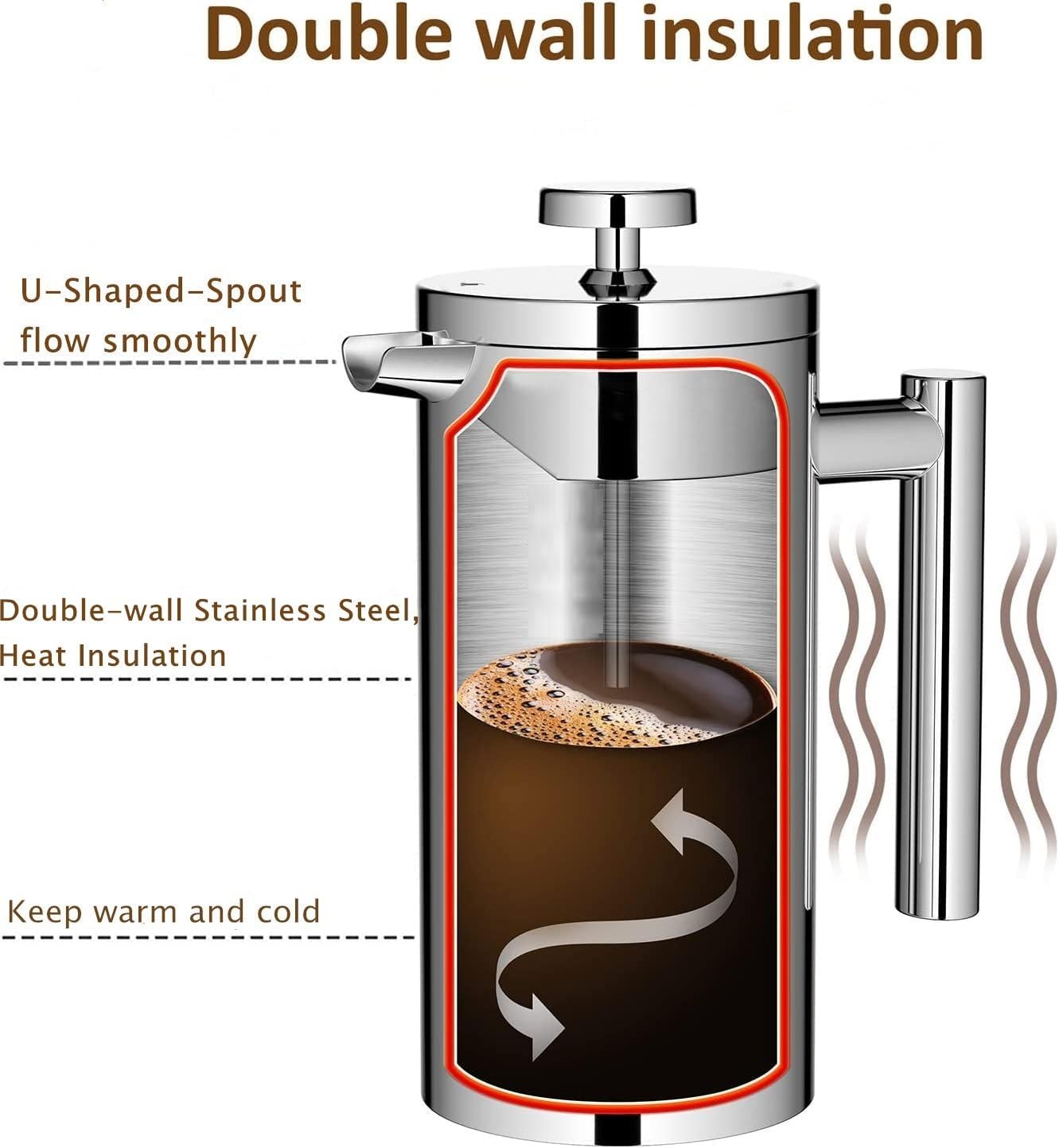 Outstanding Double wall Stainless Steel Cafetiere can keep coffee or tea warm longer than thinner steel metal french press and glass models.Thermal cafetiere made of 304 grade stainless steel giving the french press unbreakable and protecting it from rust.
