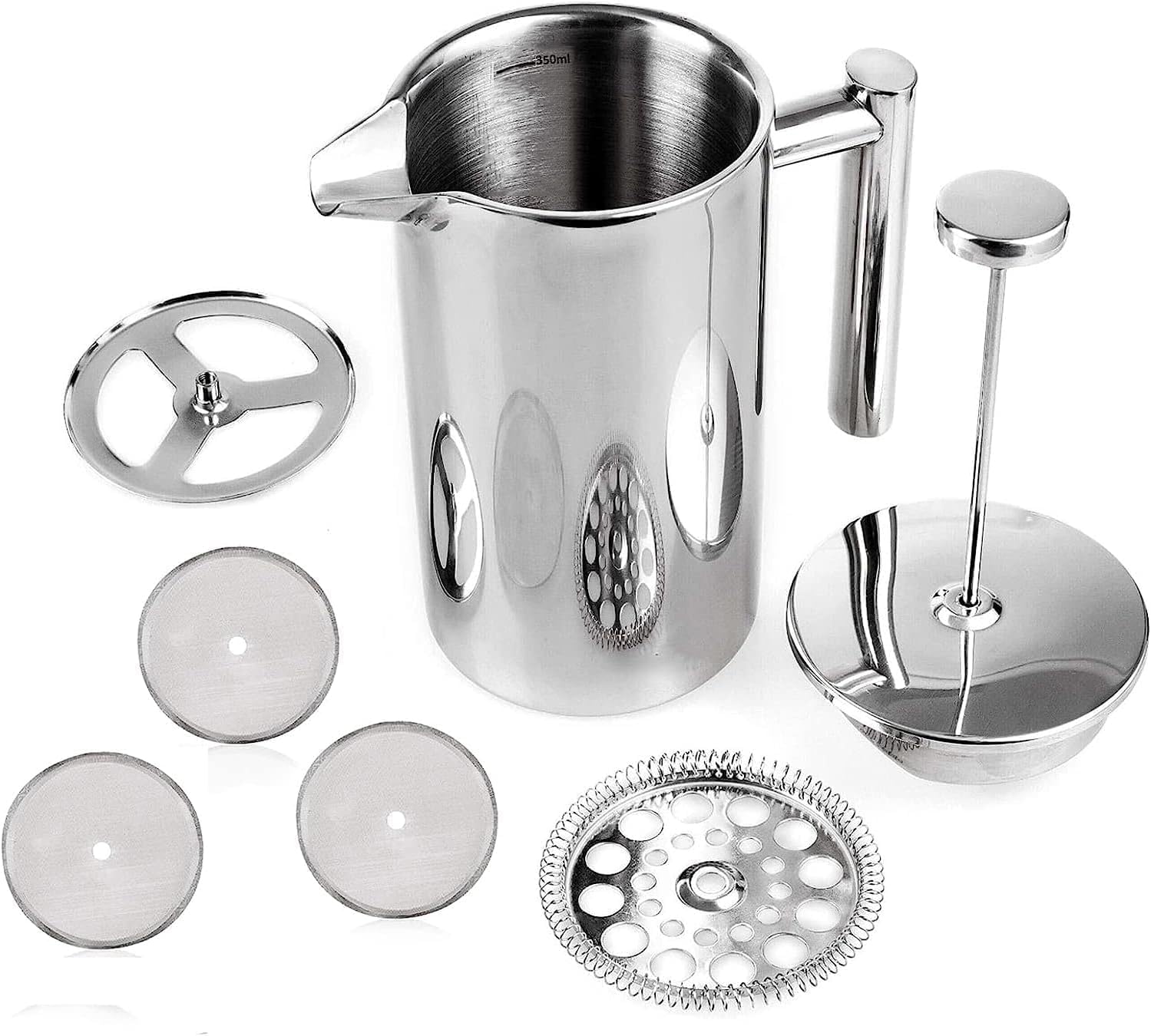MaxMiuly Cafetiere French Press Small Szie 350ml/12oz,Stainless Steel Double Wall Heat Resistant Coffee Press with 3 Filter Screens (1 Cup Silver)