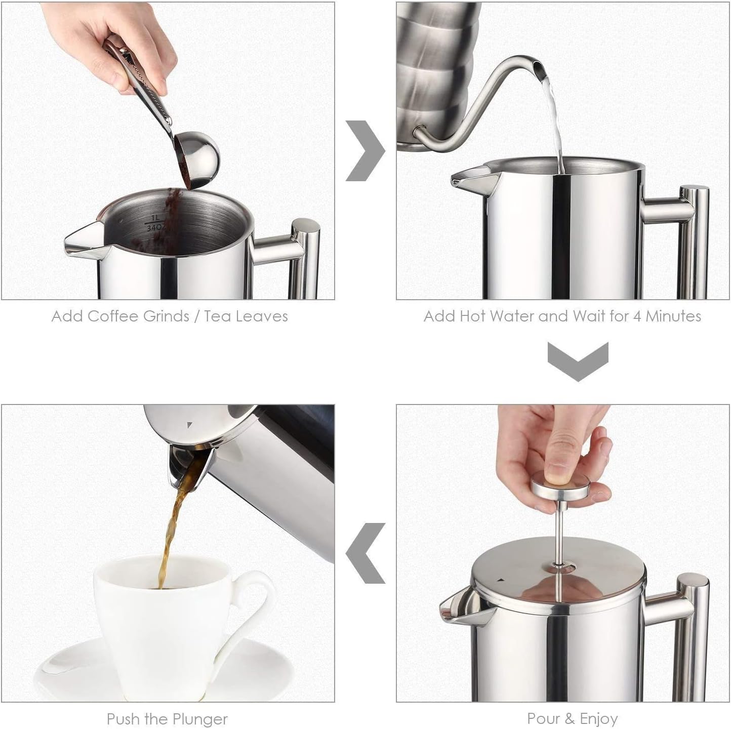 Keep Cool Touch:Double Wall stainless steel metal cafetiere insulated for hot.Cool touch handle and open-close positions of the lid make it safer to pouring.