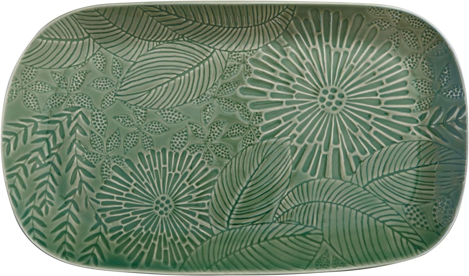 The wide expanse of green stoneware showcases its embossed foliage, lending textural and visual appeal to your table.