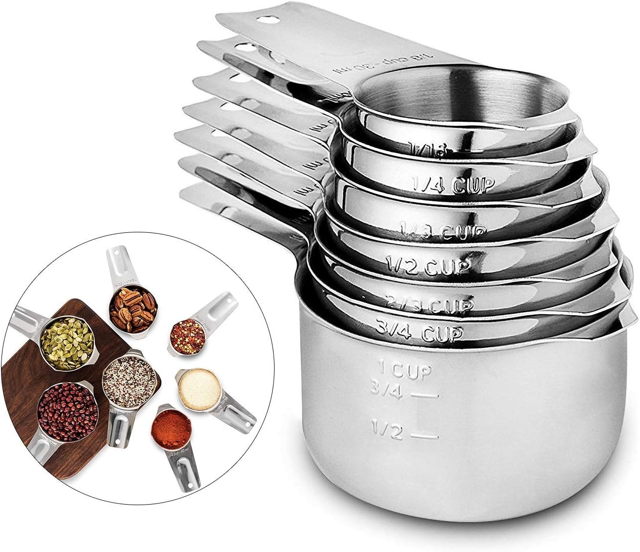FLEXIBLE SIZE:Includes 1/8 cup, 1/4 cup, 1/3 cup, 1/2 cup, 2/3 cup, 3/4 cup and 1 cup stainless steel measuring cups, each cup Includes ml and cup sizes clearly etched on each handle.