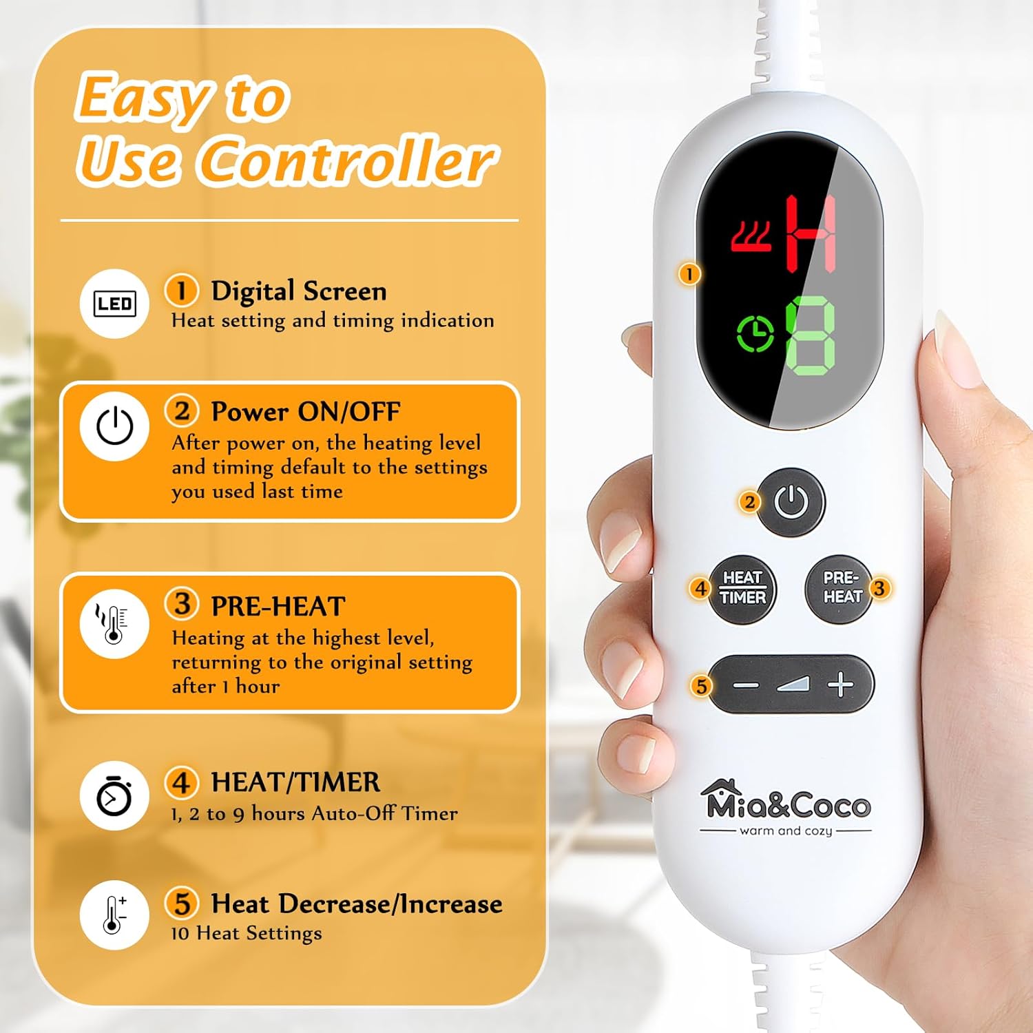 Reclaim warmth. A reliable blanket to keep warm with you on cold days. Packing list: 1x Electric blanket with controller ; 1x User manual Features: Electric throw with detachable cord ; Size: 120x160cm ; Surface material: one side flannel, another side sherpa ; Temperature adjustable: 10 levels, from 1 to 9 and H (25°C to 53°C) Specs: Size: 120x160cm ; Cord detachable: Yes Auto-OFF timer: adjustable, from 1 to 9 hours, the blanket will shut down automatically when time reaches ; Machine-Wash-able More Mia&Coco products Brand Mia&Coco Mia&Coco Mia&Coco Mia&Coco Mia&Coco Size 120 x 160 cm (47.2 x 63 inch) 160×130 cm (62.99 x 51.2 inch) 150x80cm (59.05 x 31.49 inch) M , L , XL M , L Temperature Adjustment 🤗🤗🤗 120x160cm of warmth got you covered entirely in cold days ▶️ Mia&Coco electric heated throw blanket has 10 temperature settings and 9 levels of Auto-Off timer, made with Flannel & Sherpa, so you can enjoy a comfortable winter. Customers like the comfort, warmth and control of the blanket. For example, they mention it’s soft, fluffy and great for warming up the bed. That said, they appreciate the easy-to-use control and timer. That being said, opinions are mixed on quality and performance. AI-generated from the text of customer reviews