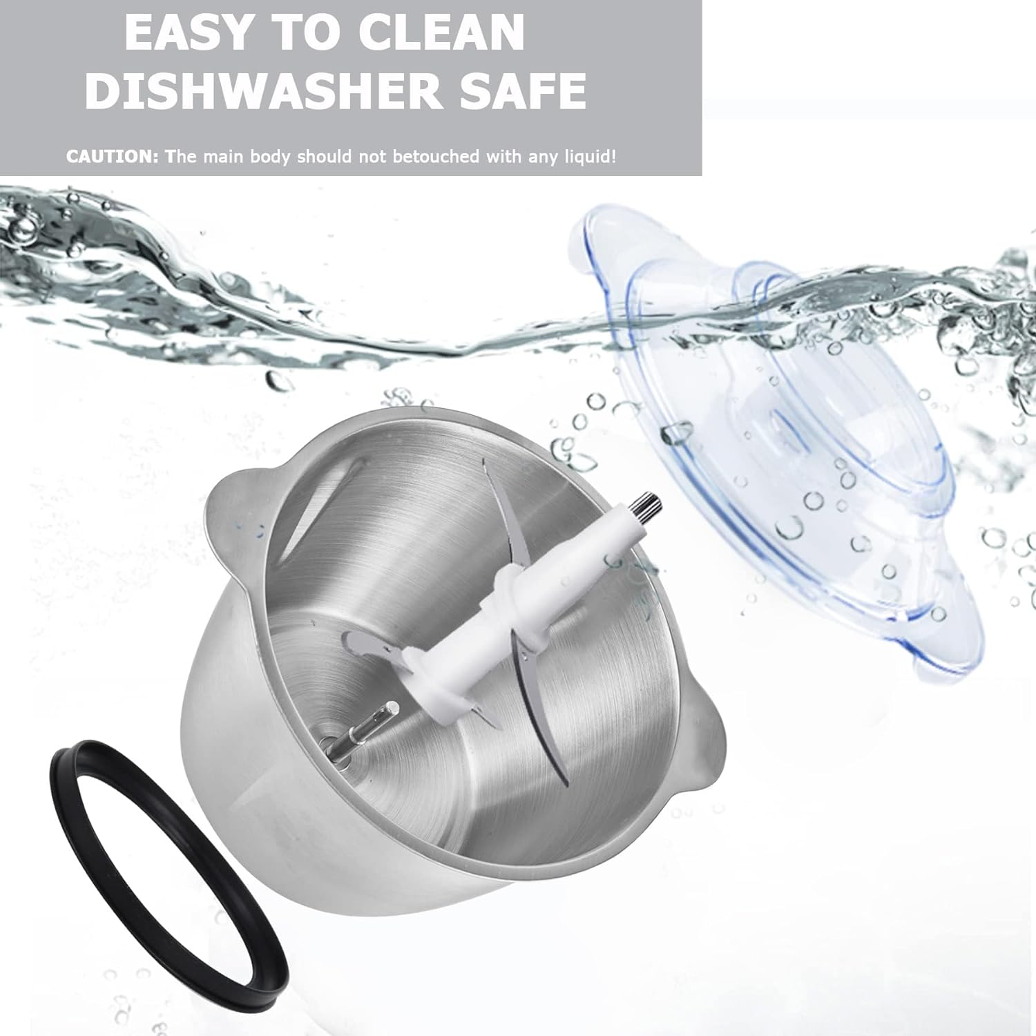 Clean up the Stainless steel bowl and blade with clear water before use for the first time and dry it up completely. Avoid leaking water into the Main body.