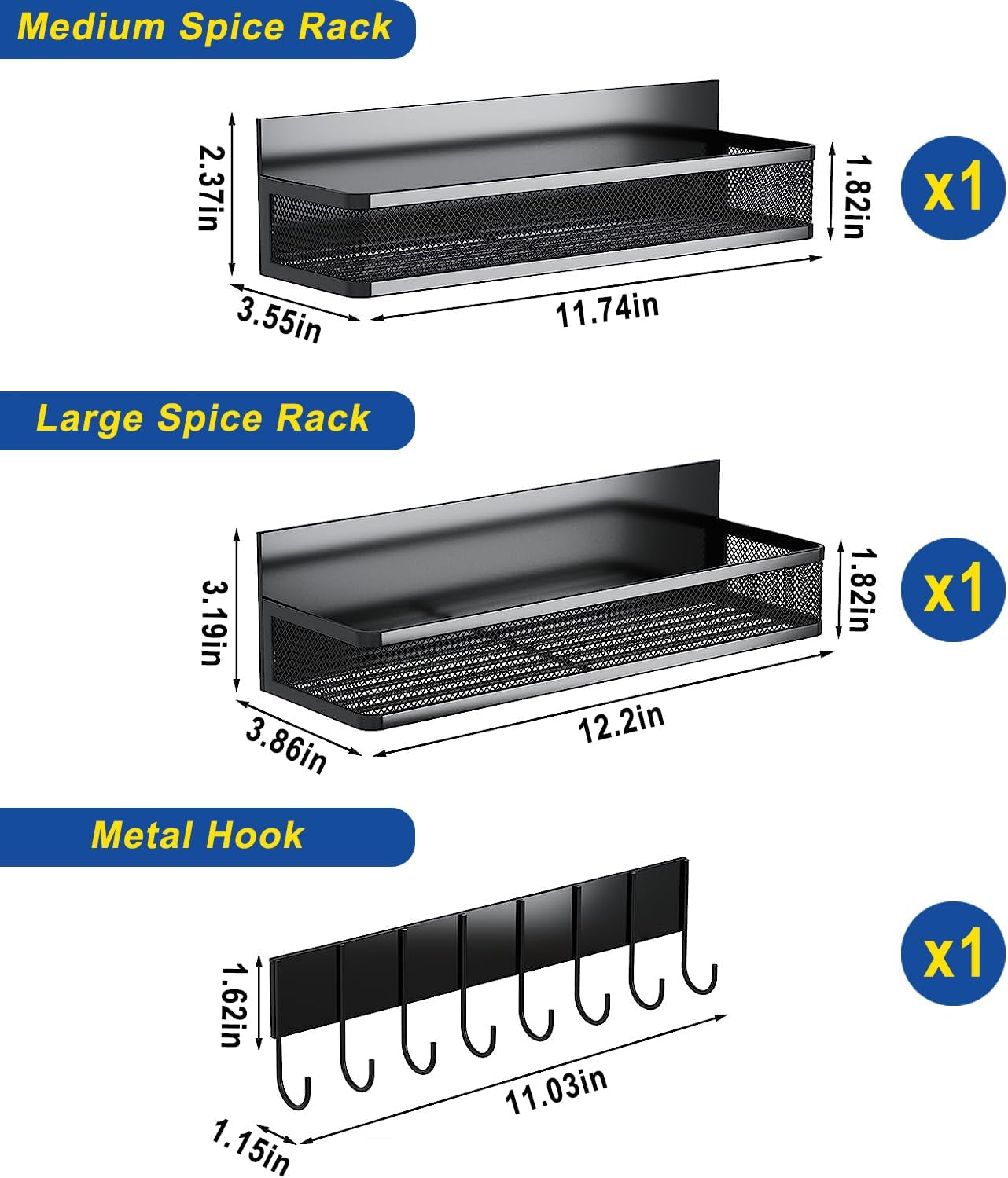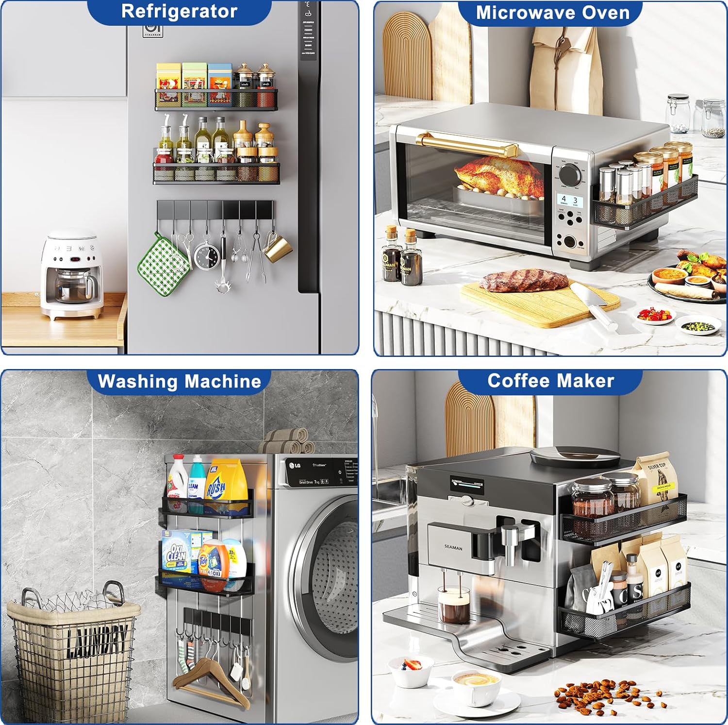 Miyawell Magnetic Spice Rack for Refrigerator, 3 Pack Magnetic Shelf, Fridge Organizer Shelves for Kitchen Organization and Storage, Moveable Space Saver Seasoning Racks with 8 Hooks, Metal&Black