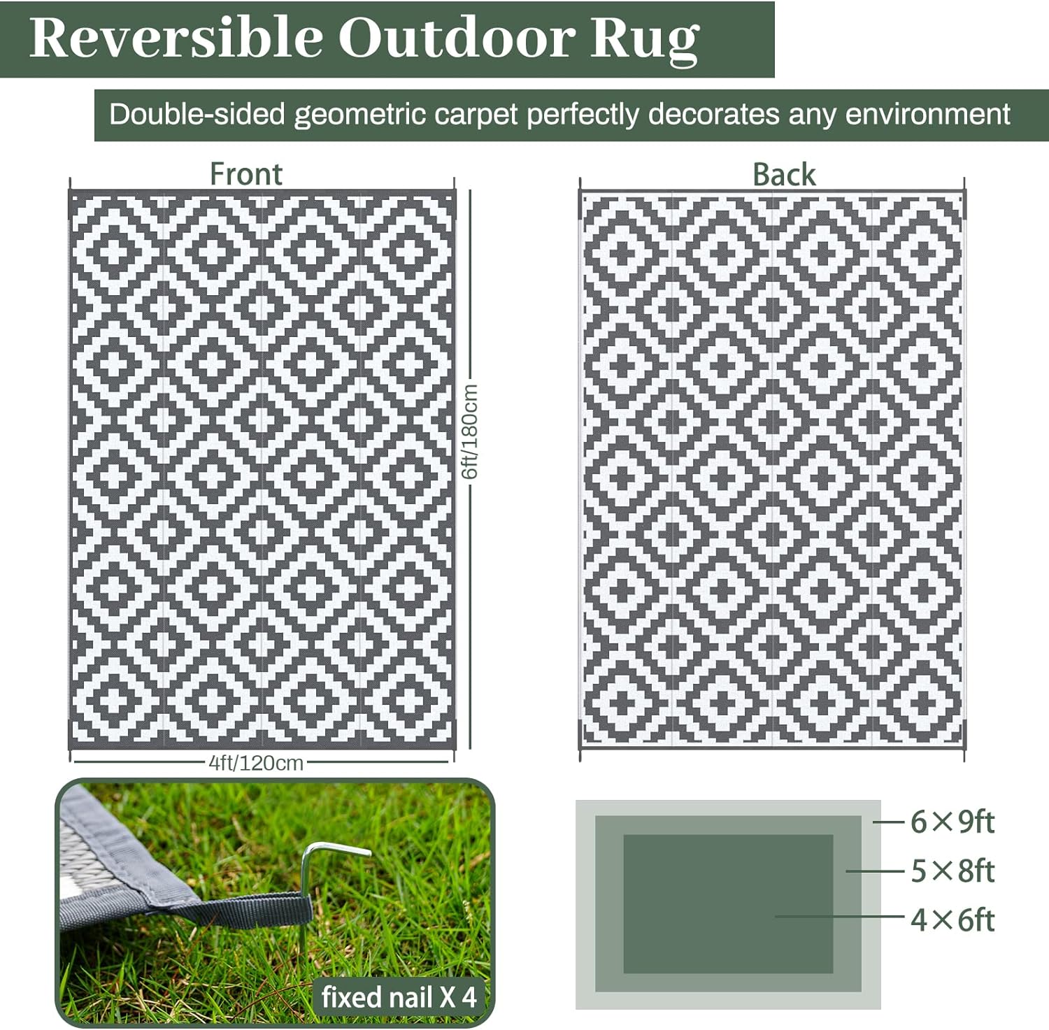 【Premium Quality】 This reversible outdoor rug is made of 100% virgin polypropylene, and the tightly woven structure provides a smooth touch without hurting the grass or scratching your deck. Heat-treated edging avoids abrasion for long-lasting.