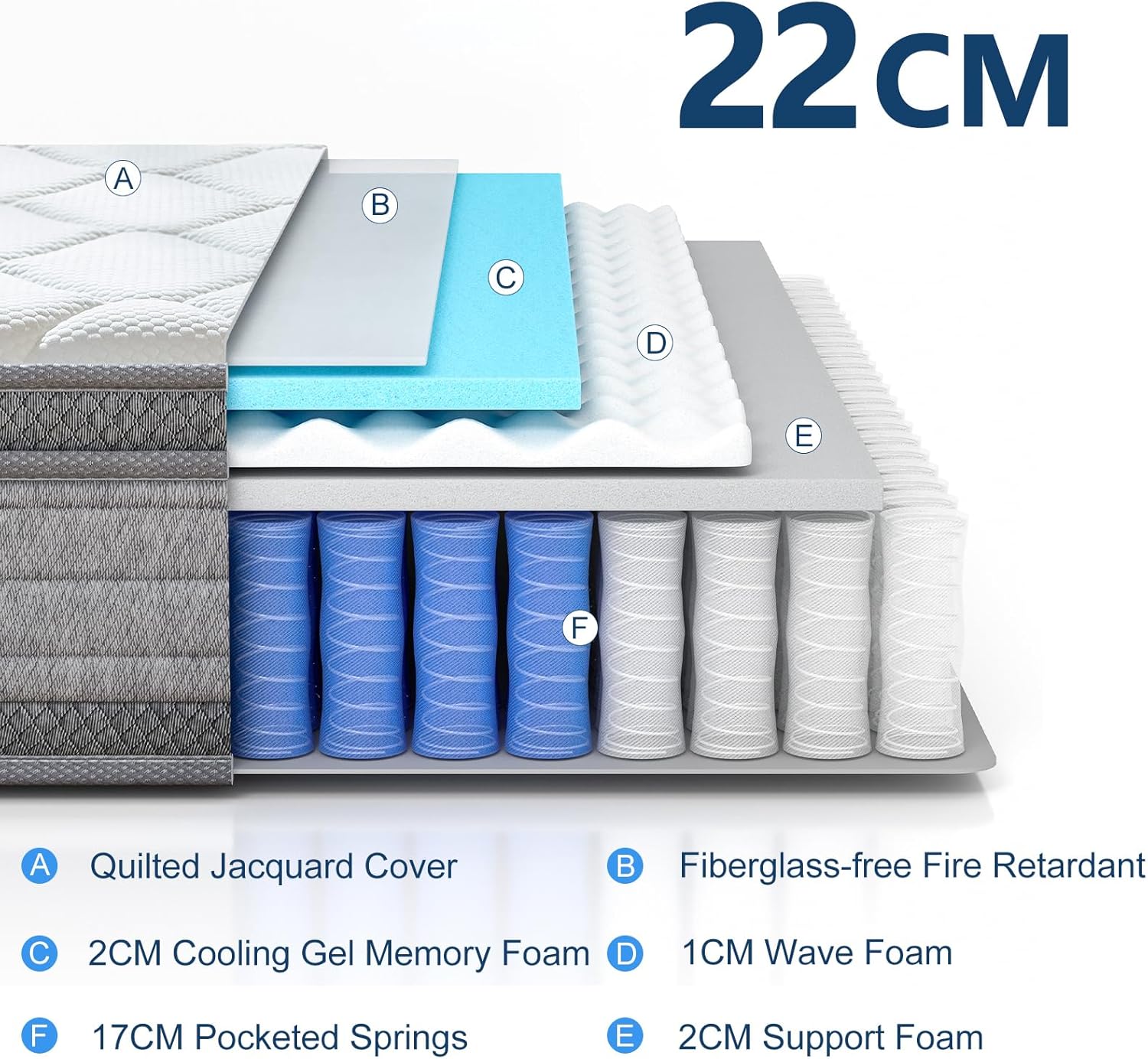 Molblly Double Mattress 4FT6 Hybrid Pocket Sprung Memory Foam Mattress with Durable & Skin-Friendly Double Mattress Bed in a Box,Comfort Foam Hybrid Mattress Double Medium Firm 135x190x22cm