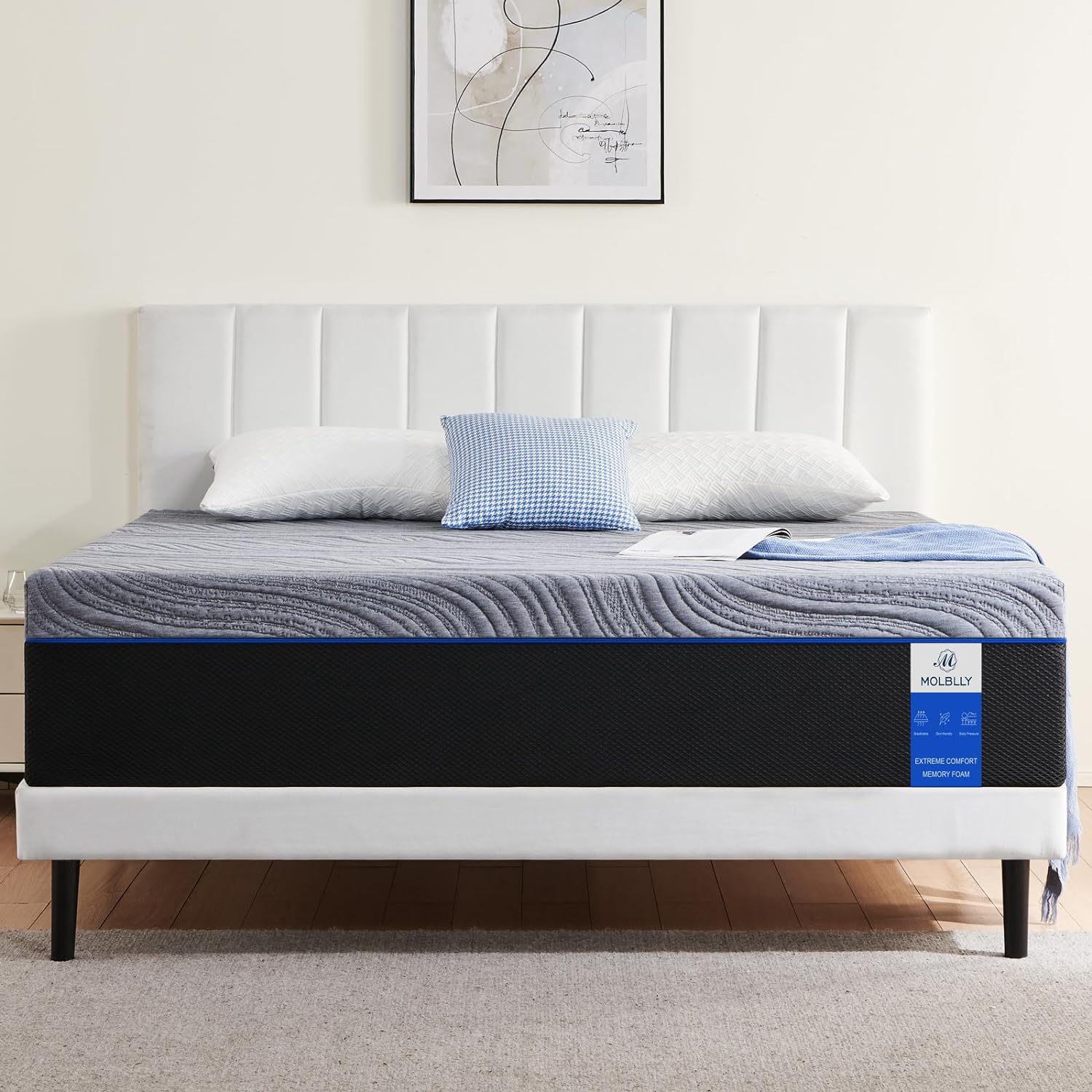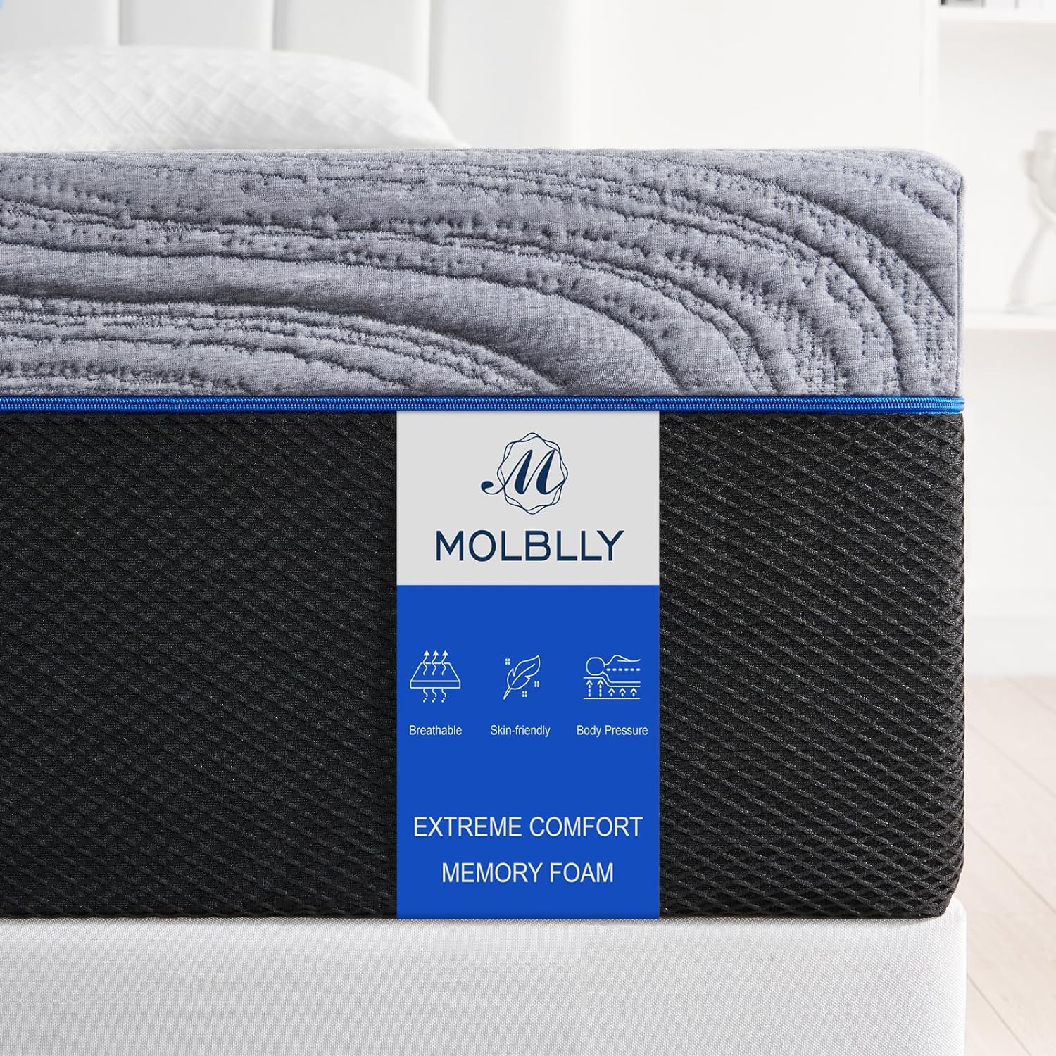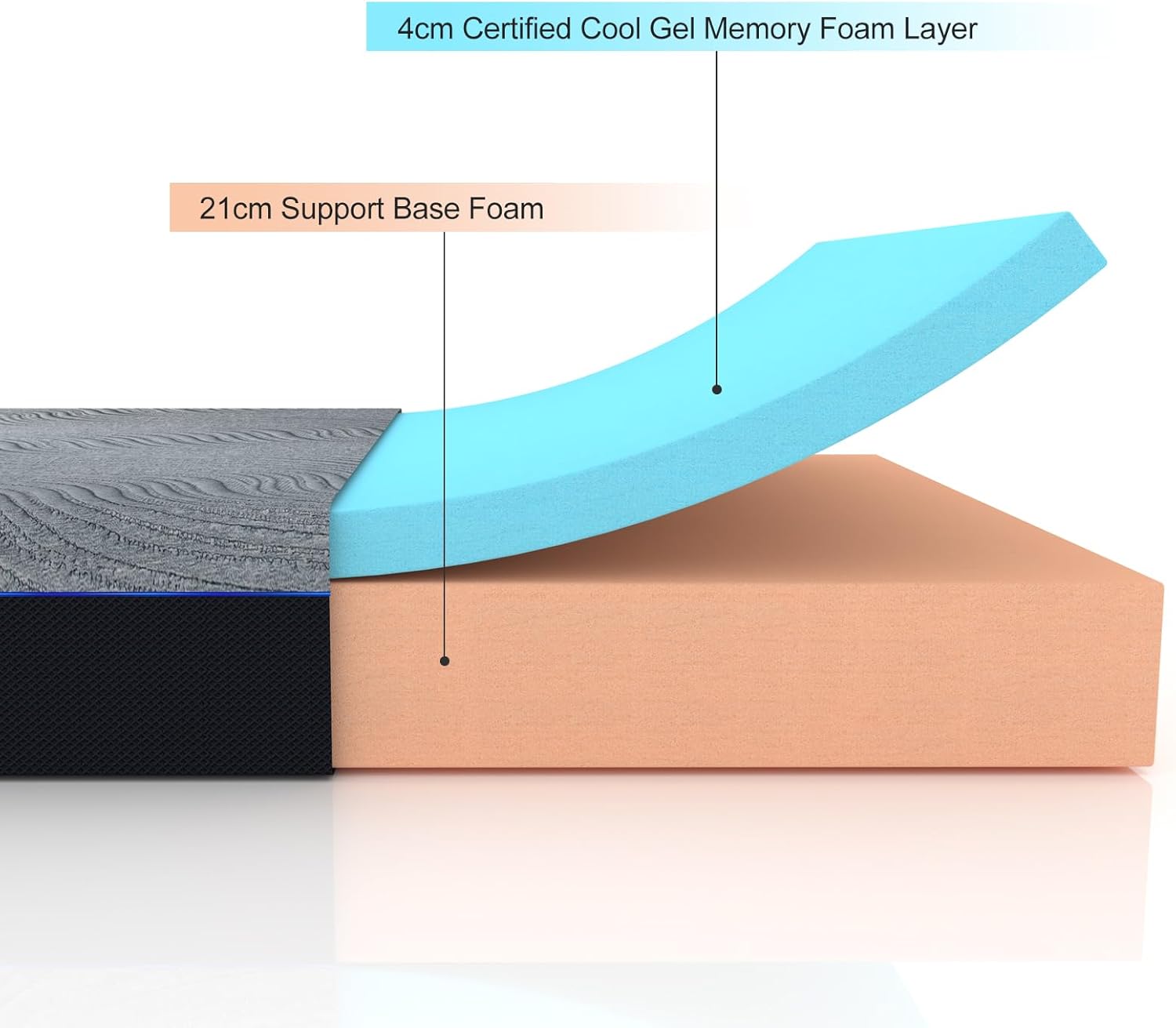 【4CM GEL MEMORY FOAM LAYER】 The Molblly Memory Foam Mattress is designed with a two layer full foam system with a top layer of 4CM gel memory foam, the gel is known as “artificial skin” for its excellent fit and skin friendly properties. Its gentle touch makes us feel floating on the water and naturally conforms to the contours of the body, allowing optimal relaxation for the entire body, creating a deeper, longer and sweeter sleep.