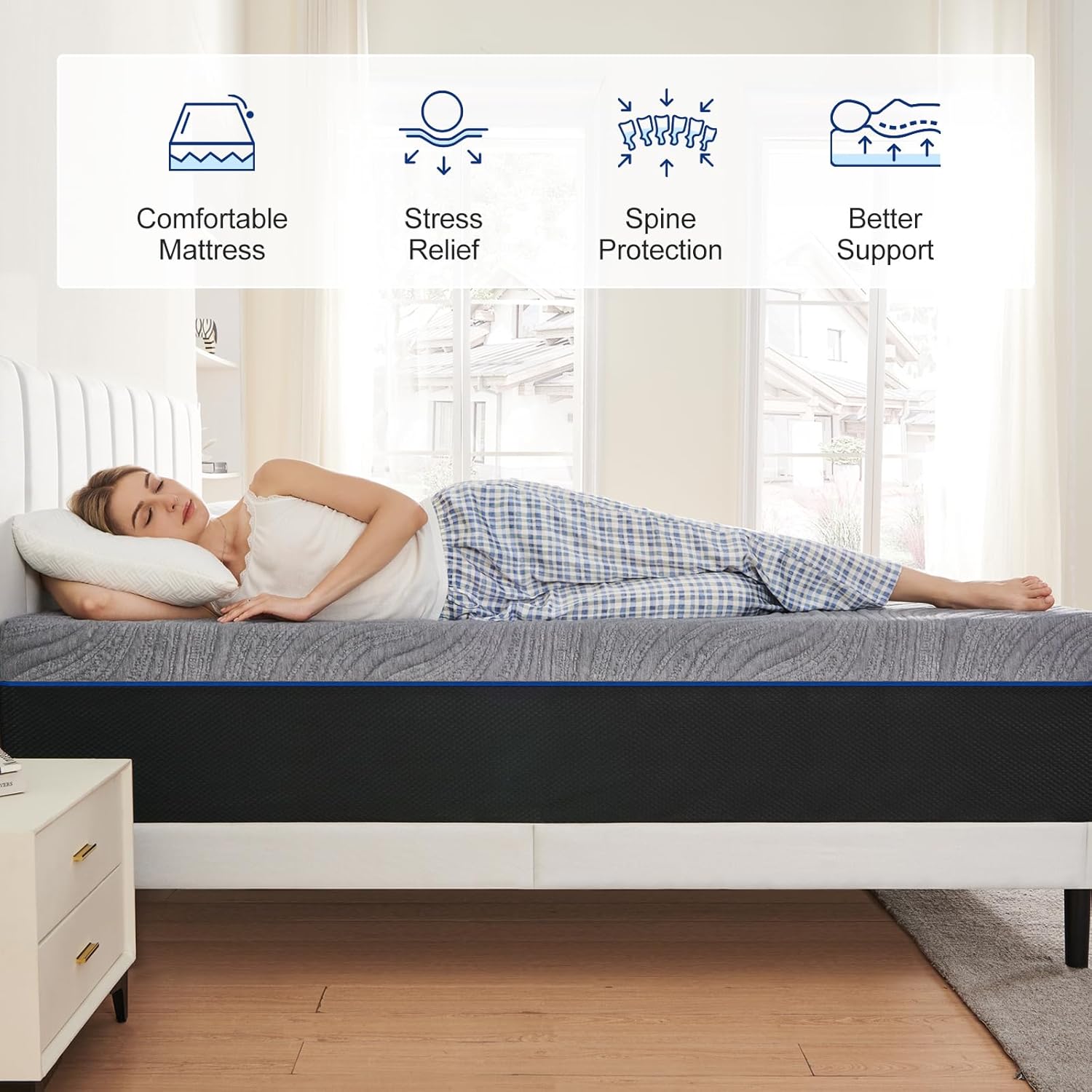 【Medium Firmness】Medium Firm Mattress offers a medium-firm feel that strikes the perfect balance between comfort and support. It provides enough plushness to relieve pressure on your joints, while still offering a solid foundation for your body. Whether you sleep on your back, side, or stomach, medium-firm mattress provides enough plushness, while still offering a solid foundation for your body.