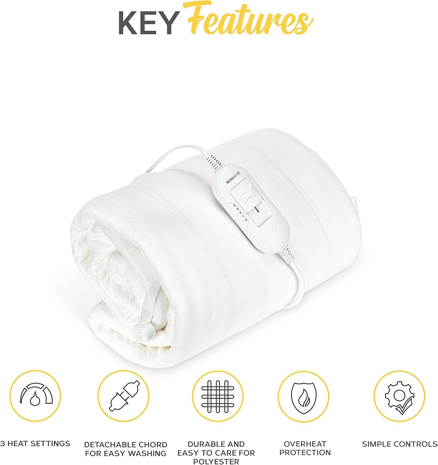 MONHOUSE Premium Soft Fleece Electric Blanket – Heated Under Blanket – Heated Mattress Cover – Detachable Controller & Machine Washable – 3 Heat Settings – Double 120x135cm – White