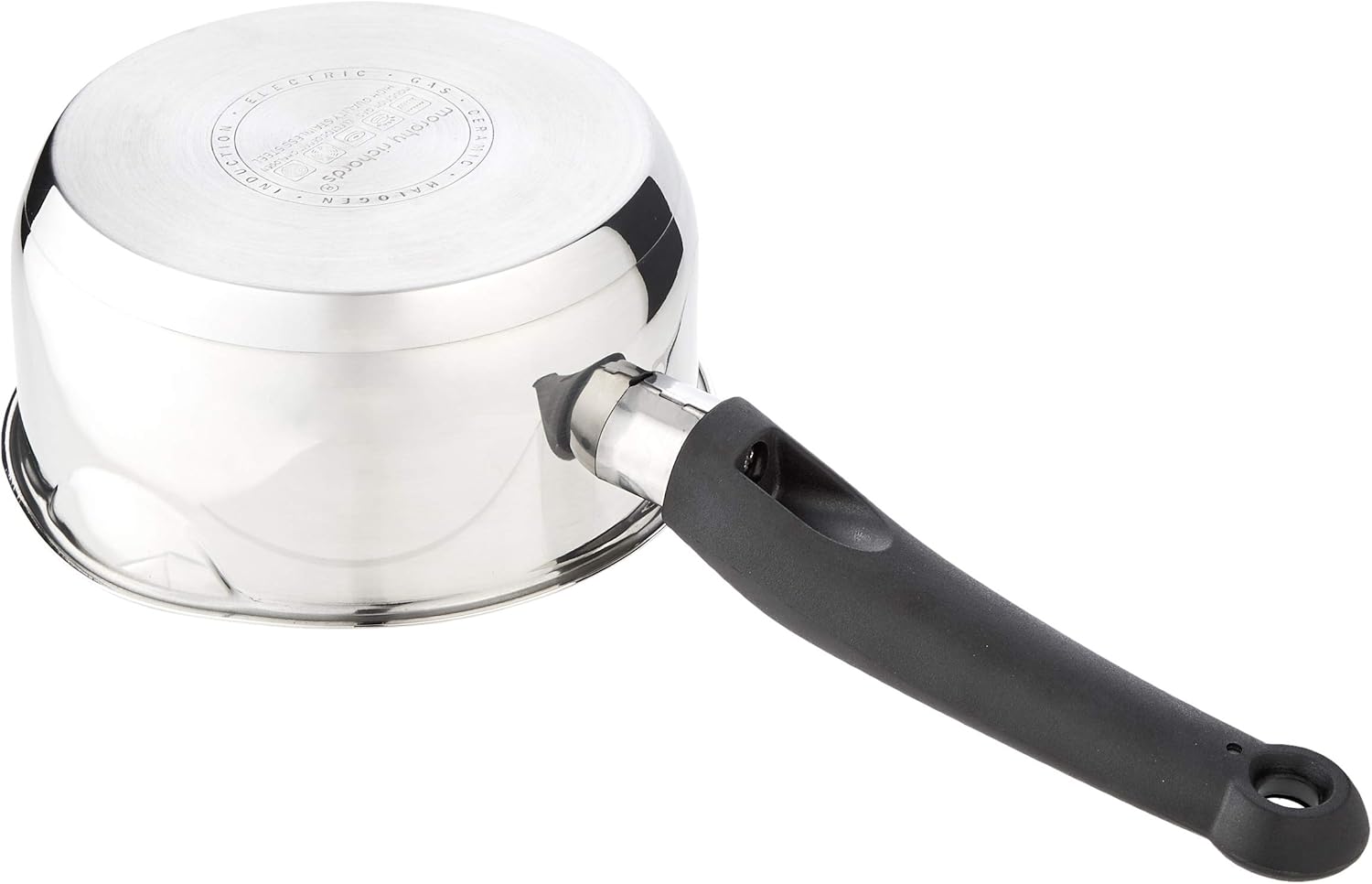 High quality stainless steel saucepan with pouring Polished stainless steel finished exterior Satin finished interior with capacity marking Featuring double spouts and pouring lid Bakelite stay cool handle for safe use Energy efficient bonded stainless steel base Suitable for use on all hobs types including induction Dishwasher safe