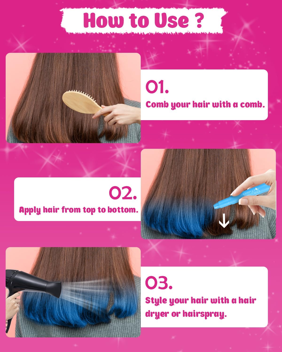 【Tips】To maintain the quality of the hair chalk, make sure to store it in a sealed container and avoid exposing it to air. Please note that slight fading or dryness of the hair may occur, which is normal. Before sleeping, we recommend washing out the hair color to prevent any stains on your pillowcase.