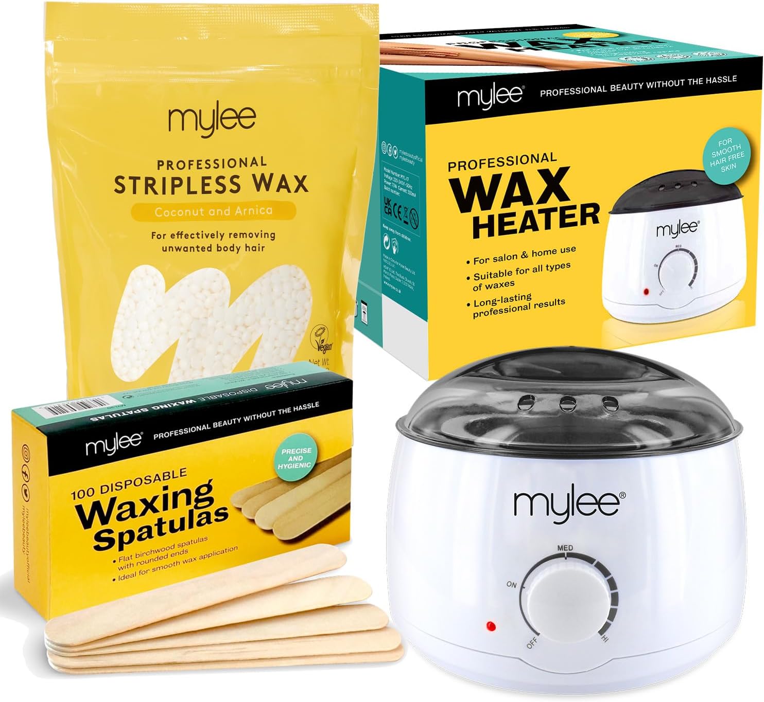 Mylee Professional Waxing Kit with Wax Heater, Hard Wax Beads 500g, Spatulas – Stripless Depilatory Waxing Pellets Solid Film Beans No Strip Needed (Coconut & Arnica)