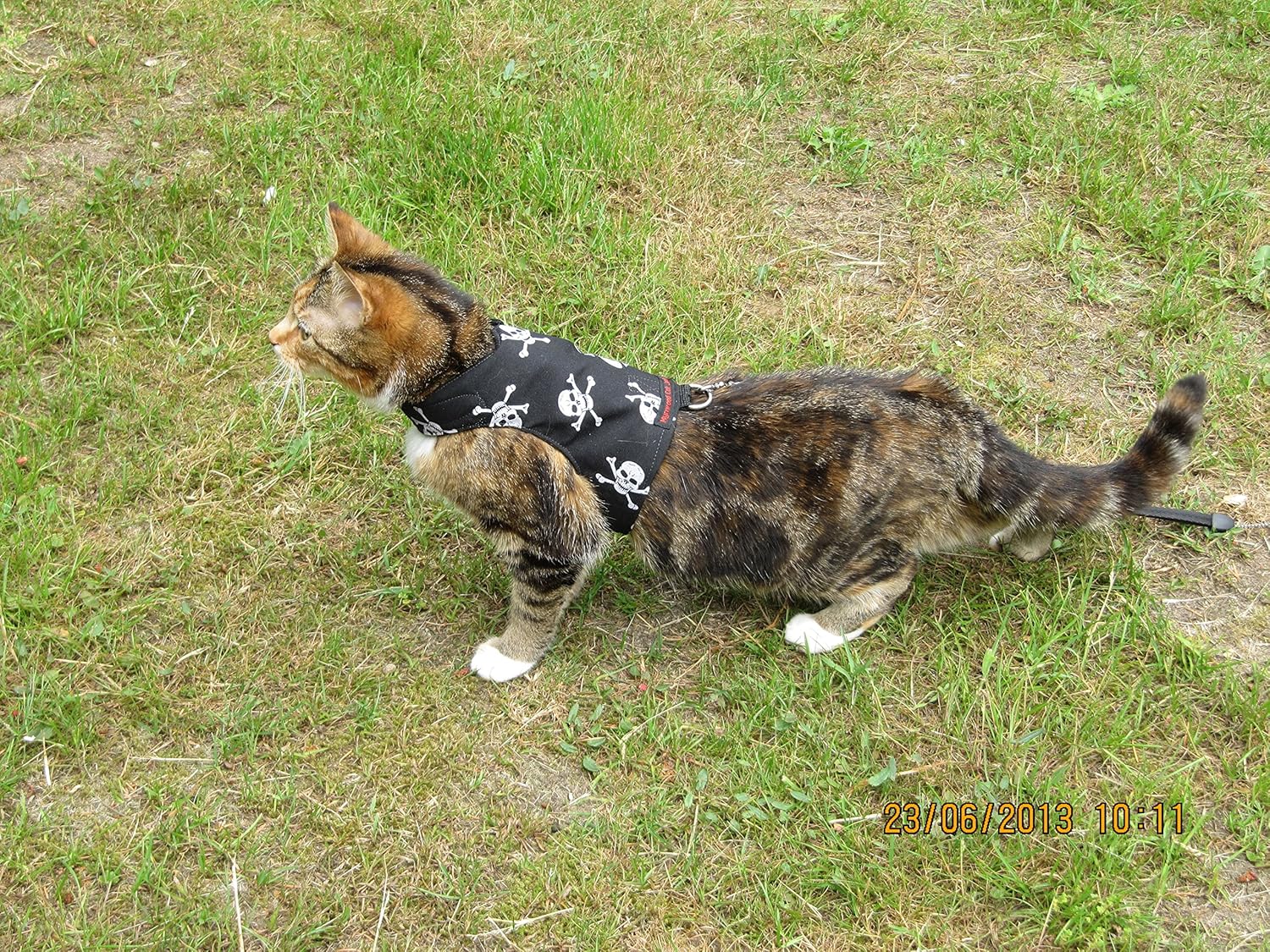 My name is Maria, I live in the Highland of Scotland and I am the designer of the original cat jacket/harnesses. I make each of my cat jackets by hand, from quality materials. I am a proud owner of 2 Bengals; Otis and Sherlock and Barney my gorgeous Maine Coon, who keeps the others on their toes! I soon realised that the many harnesses on the market were not secure and not feline escape proof. Cats were easily escaping from them by simply ‘reversing’ out of them. While developing my design, I did a lot of research. My design incorporates opinions and feedback from cat breeders and other owners. Satisfaction Guaranteed My design fulfils the 6 main aims for success: 1) Security, 2) Strength, 3) Practicality, 4) Design, 5) Comfort, 6) Customer satisfaction Handmade Quality My jackets are made to suit your cat’s requirements. I make each jacket using quality fabrics. It fastens securely around the neck and chest with long strips of hook and loop. All jackets are reversible with black cotton. My jackets are extremely durable, triple sewn for strength, hard wearing and machine washable. They are easy and quick to put on and adjust to your cat. They have a super secure welded steel D-ring with extra reinforced stitching to attach your lead to go for walkies. Please never leave your cat unattended outside. My jackets are not designed for the cat to be left outside unattended whilst attached to something.