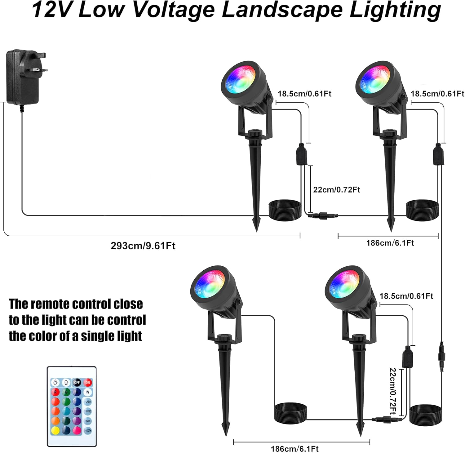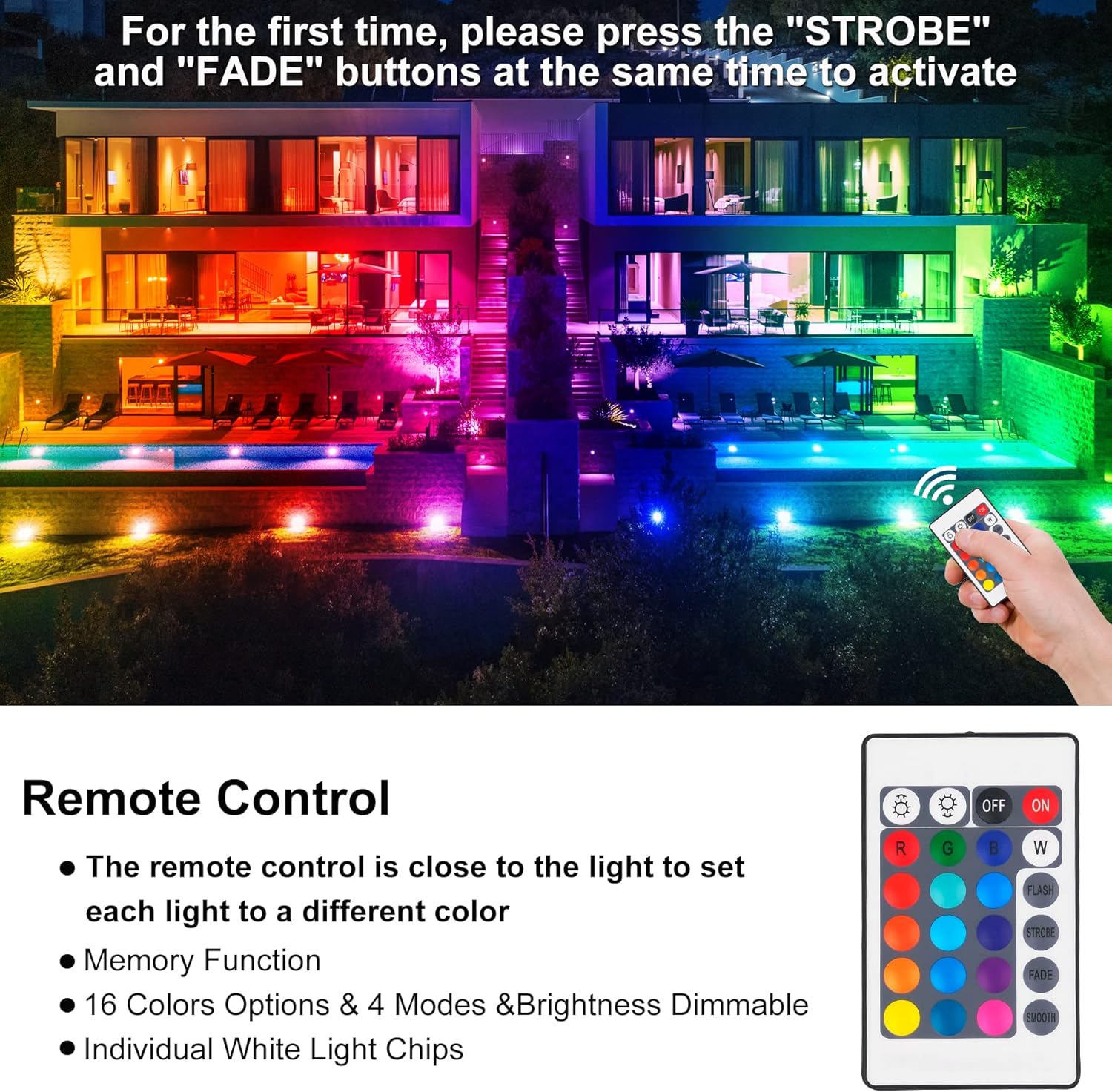🌈【RGB Garden Light with Remote Control】 There are 16 RGBW colors and 4 lighting modes with adjustable brightness/speed on this lamp. With a memory function, this RGB spotlight always remembers your last color. No need to reset.