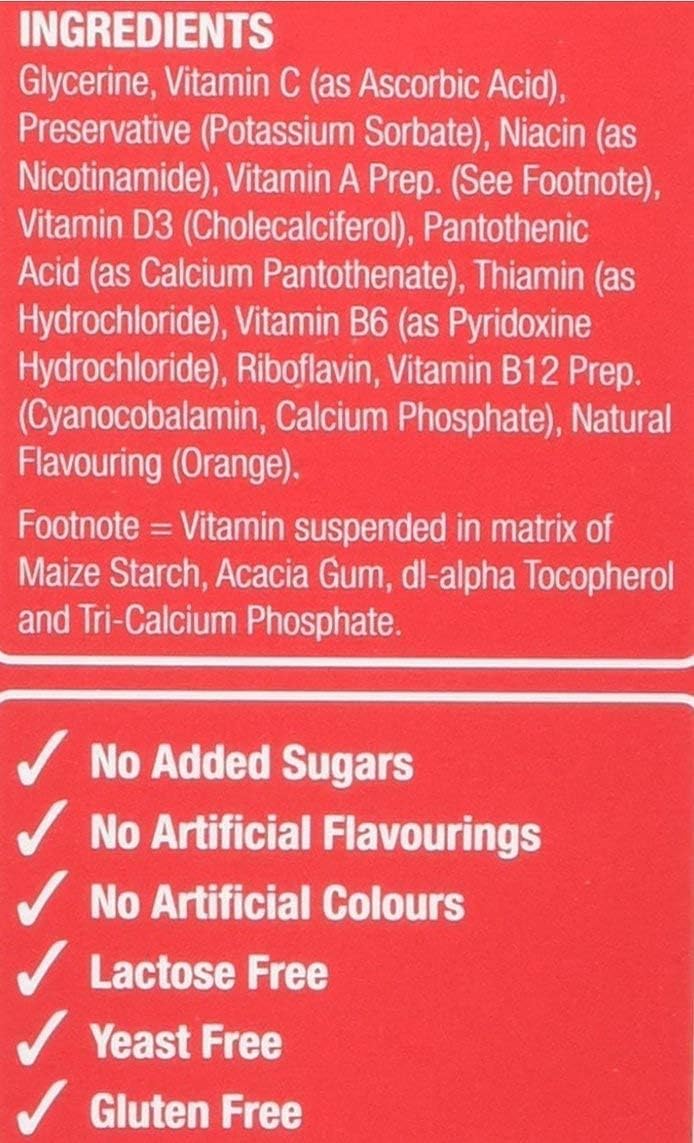 Includes vitamin C for normal immune functon, vitamin D for normal bones and B1, B2 and Niacin to support normal energy production.