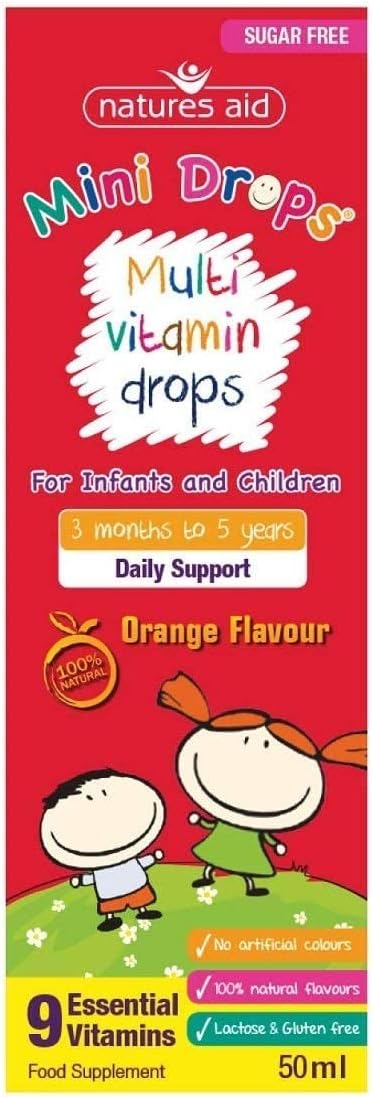 During their early years, children have a very high nutritional need and vitamins play an important role in their growth and development. Despite our best intentions many of our diets lack the nutrients we need and a multi-vitamin supplement therefore becomes an important addition to the diet Natures Aid Multivitamin Mini Drops is a carefully balanced blend of nine essential vitamins, designed for infants and children aged three months to five years. Includes vitamin B1, B2 and Niacin for normal energy yielding metabolism, vitamin D for normal bones and vitamin C for normal function of the immune system. With a pleasant natural orange flavour, these drops can be easily added to milk, formula, juice or water. Dropper included. Mini Drops was the UK’s first 100 percent sugar free range of children’s supplements and the range contains no artificial flavours or colours. The liquid drops help to bypass the choking hazard presented by tablets, with none of the sugar or additives associated with gummies. Directions for use: Infants and children aged three months to five years old: Take 1 ml daily. Do not exceed the recommended intake. Suitable for vegetarians Contains NO: GM products, Artificial Colours, artificial flavours, corn, dairy, gluten, yeast, wheat, lactose, nuts, salt, soya, starch or sugar.