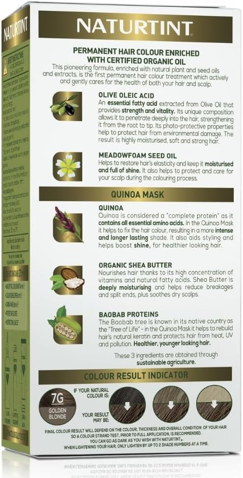 (as of [price_update_date] – DetailsLong lasting, naturally radiant colour and shine, now with a 50ml Multi-Care Mask enriched with quinoa to use immediately after application and to maintain your colour in the weeks following! Permanent Hair Colour with 100% grey coverage, in an easy to use, non-drip gel formula enriched with natural plant and seed oils and extracts to gently care for your hair and scalp, with no ammonia. Lighten your natural hair colour by up to two shades, go as dark as you like or simply cover greys – with 30 shades ranging from Ebony Black to Light Dawn Blonde, all suitable for mixing, there is a unique colour for everyone! Safety Warning – Contains phenylenediamines and hydrogen peroxide. A skin test should always be carried out 48 hours before the use of any hair dye, even if you have used it before. If you experience any reaction to the test, you should not use the product. We strongly recommend carrying out a strand test at the same time, to assess the selected tone and determine how long the colour needs to develop. Box Contains – Naturtint Colourant (60ml), Naturtint Colour Developer – in Applicator Bottle (60ml), Naturtint Multi-Care Mask (50ml), Gloves, Instruction Leaflet.