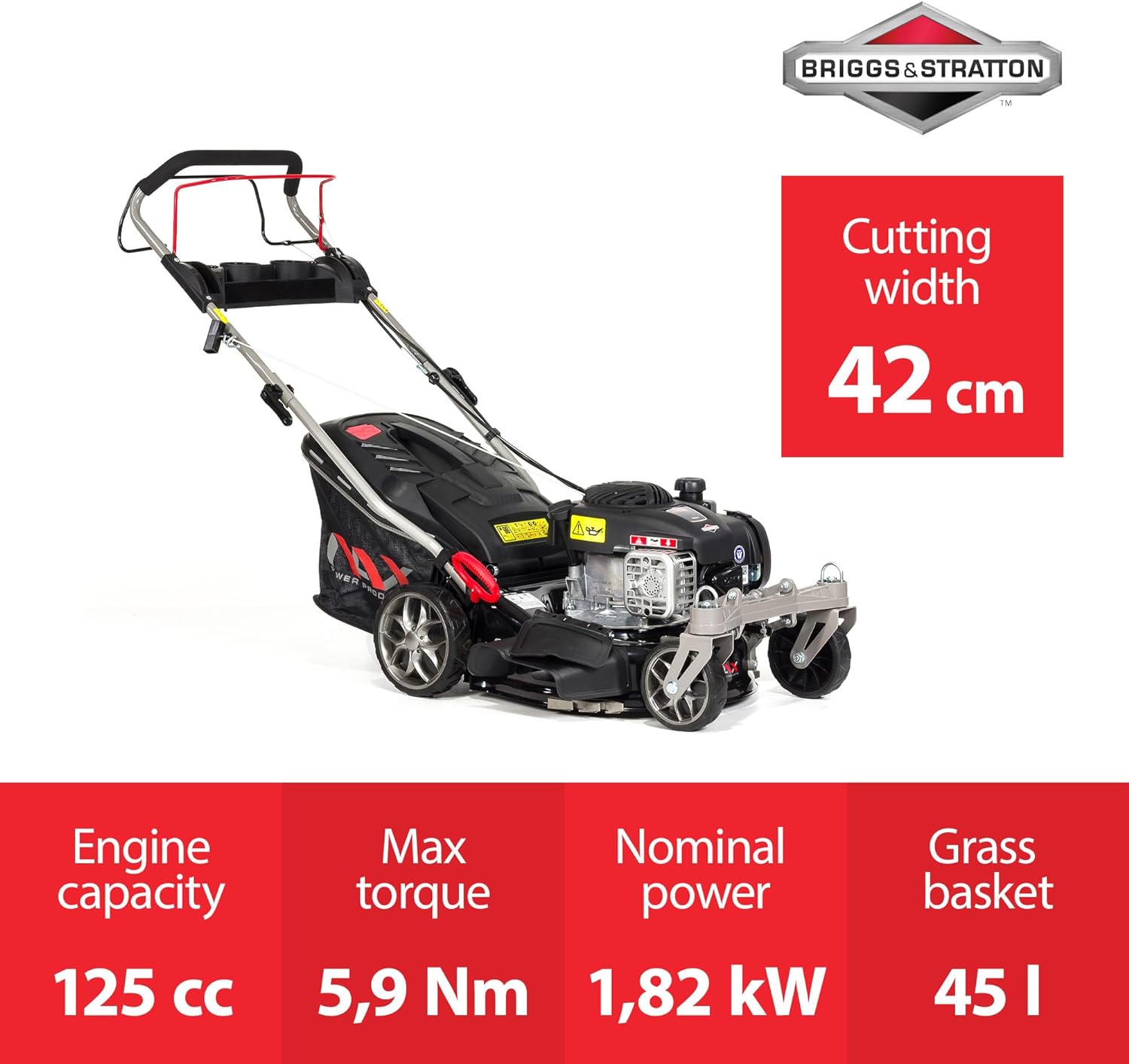 NAX POWER PRODUCTS 1000S self-propelled lawn mower with Briggs & Stratton combustion engine of 125 cm3 capacity, 450E series, mowing width 42 cm 45-litre basket deck cleaning system