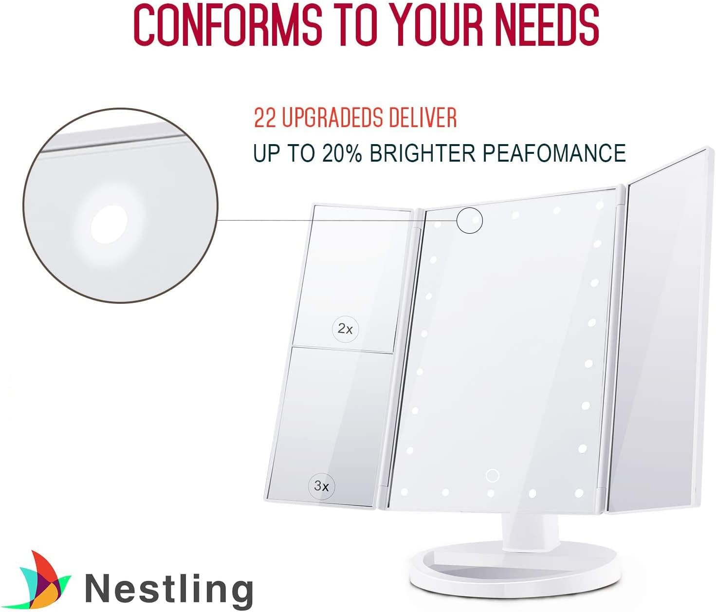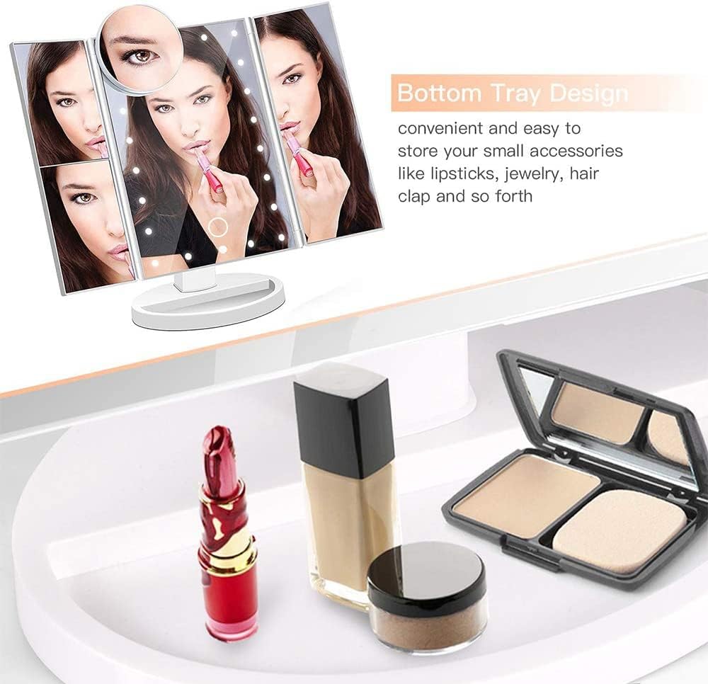 Nestling Vanity Cosmetic/ Makeup Mirror with 22 LED Lights, Touch Screen, Magnification Tri-Fold 2X 3X Magnifying, 180° Free Rotation, Dual Power Supply (White)