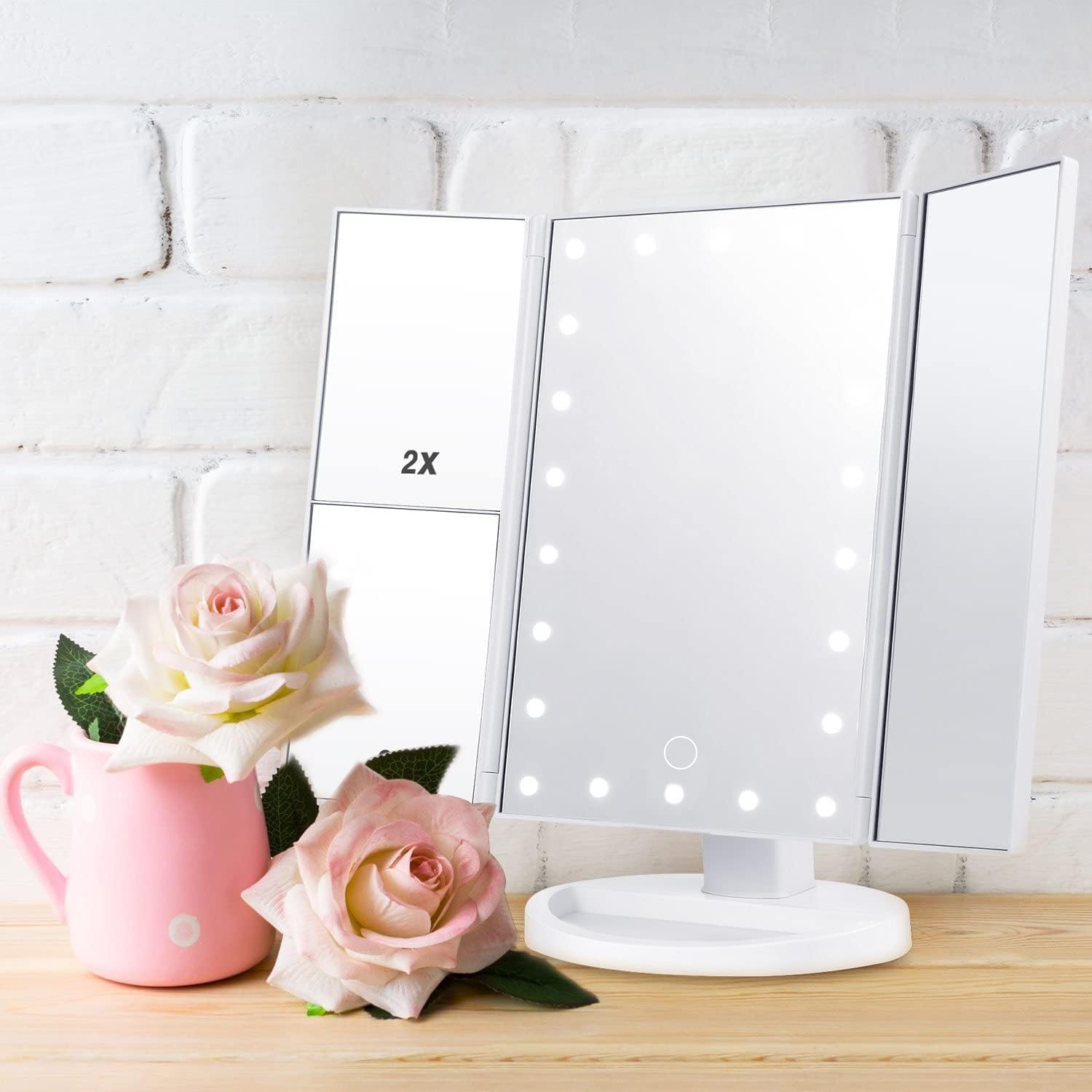 🌸【Adjustable 22 LED Lights】22 LED Lighted Makeup Mirror allow you makeup in the dark or poorly lit areas. Led lights brightness control by the touch sensor switch. Long pressing the touch sensor switch to adjust the brightness.