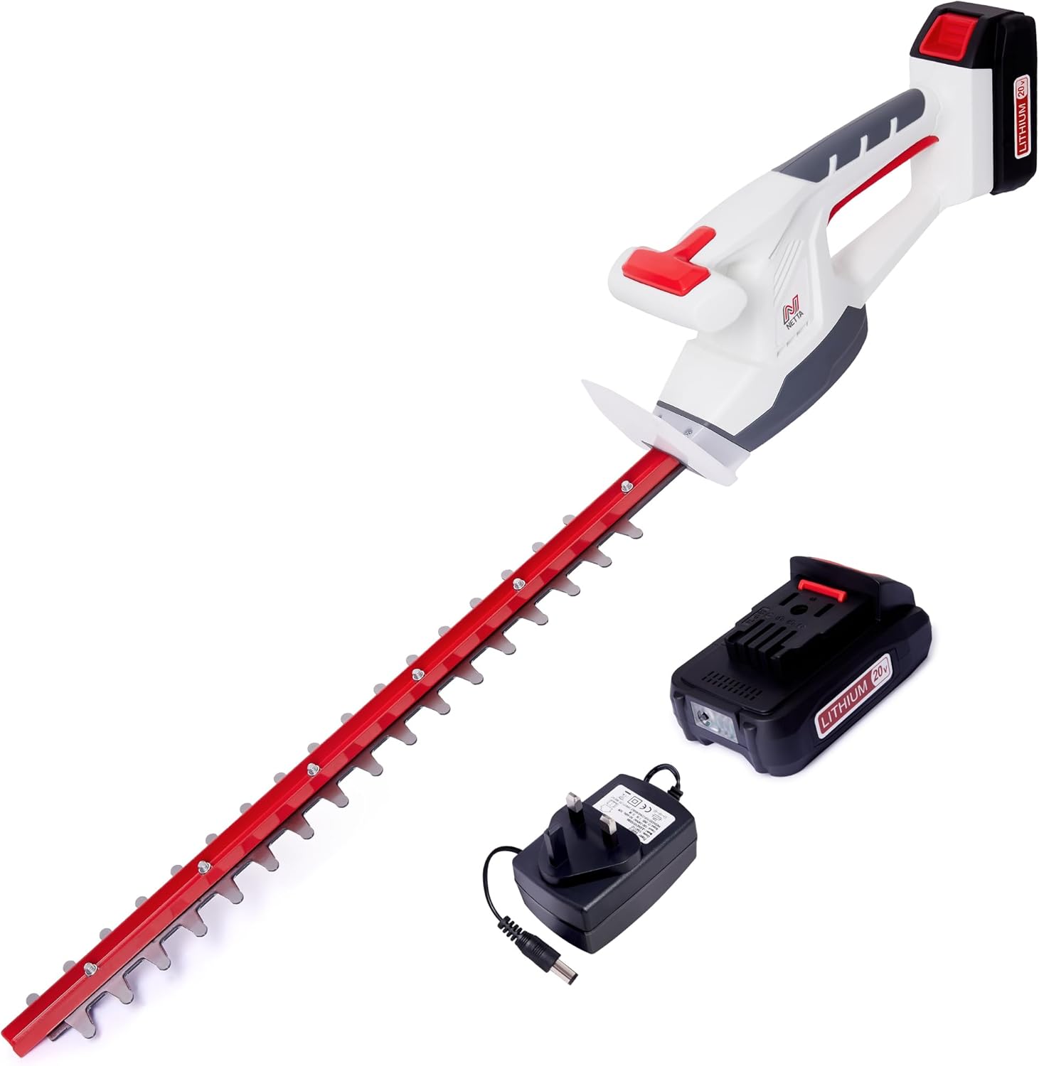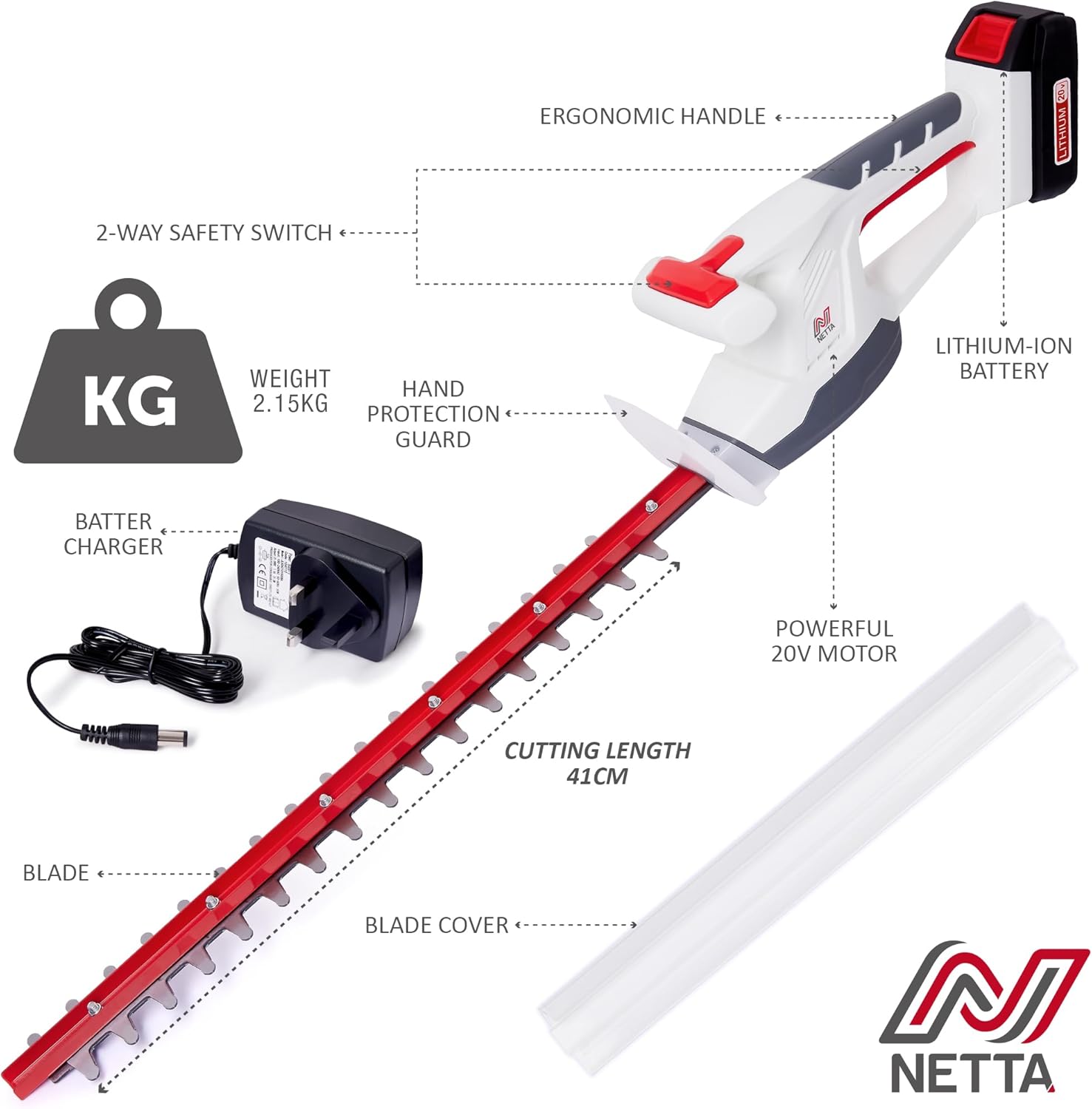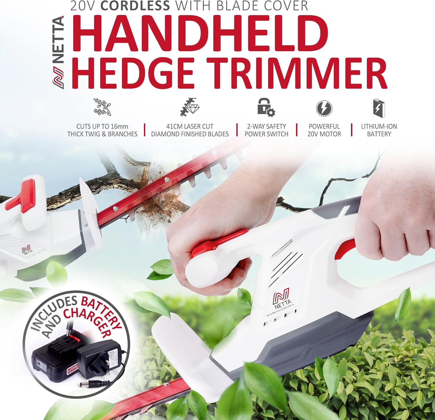 NETTA Cordless Hedge Trimmer & Cutter 20V MAX- Ultra-Light 2.15KG, Battery & Charger Included – 410mm Laser Dual-Action Blade