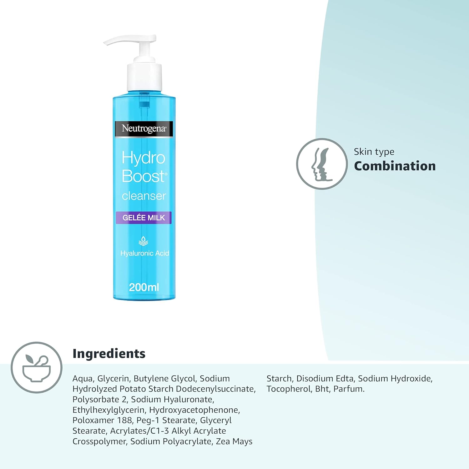 The Next Wave of Hydration is Here Neutrogena Hydro Boost Gelée Milk Cleanser is an innovative cleanser combining the lightness of a gel with the efficacy of a make-up remover milk. The combination of the Neutrogena cleansing technology, hydrating agent and hyaluronic acid which is naturally found in skin, helps protect the skin barrier, quench skin and boost vital hydration.