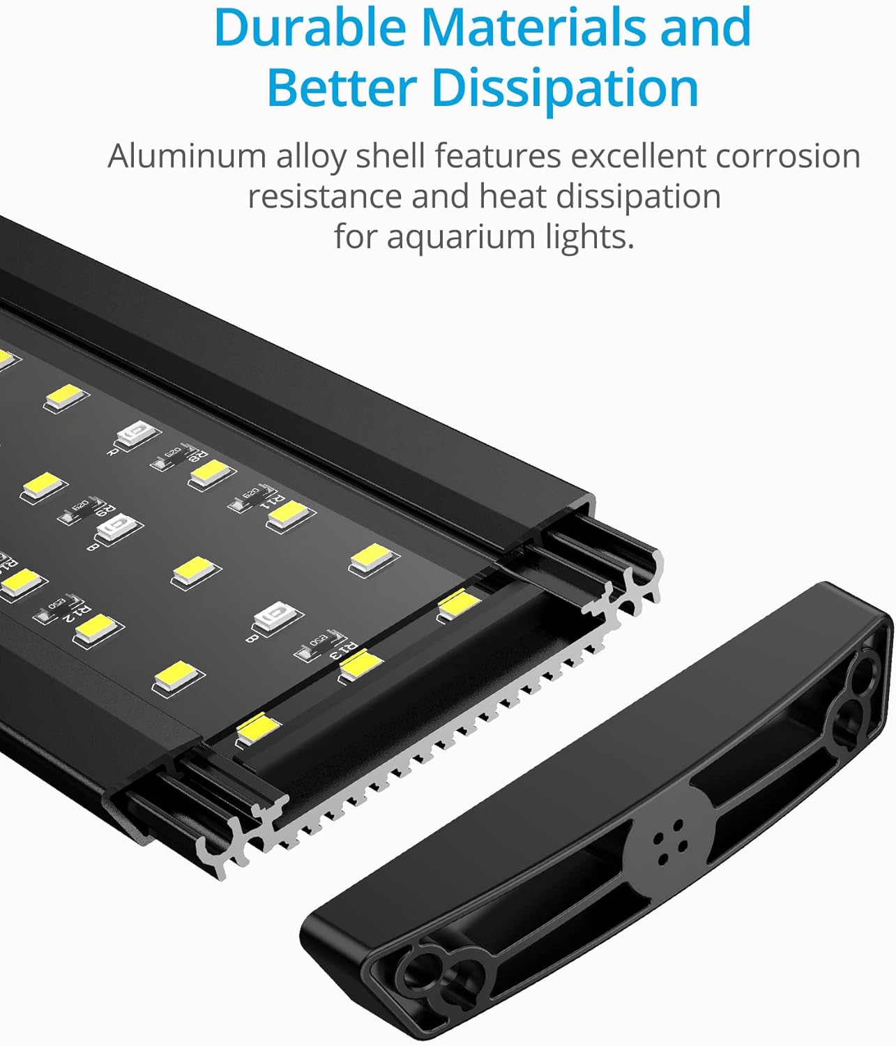 Pairs super-bright 6500K white LEDs with 460nm blue, and 660nm red LEDs, high output LED chips with 120° angle provide optimal spread and color blending, promoting healthy, vibrant growth of fish and aquatic plants