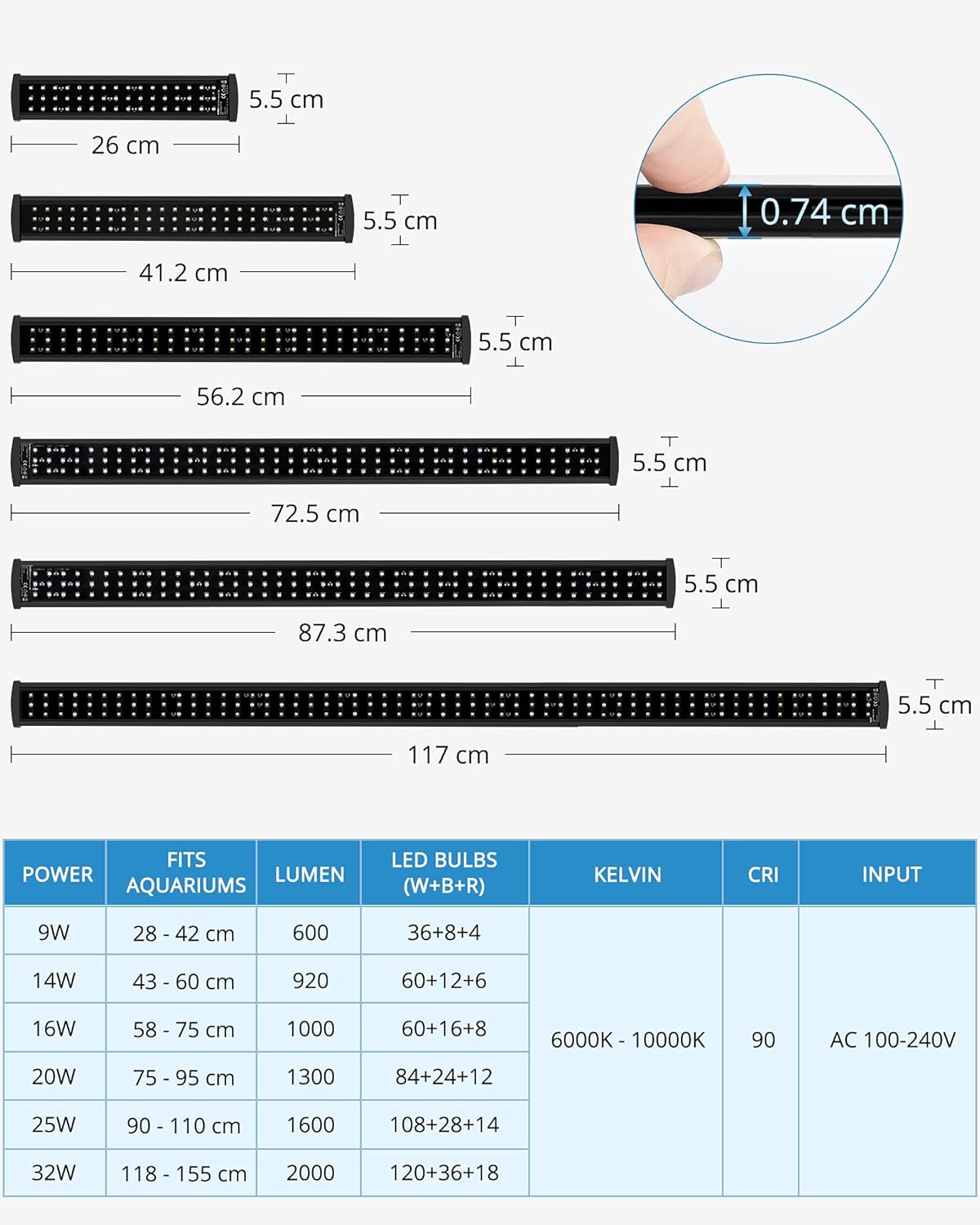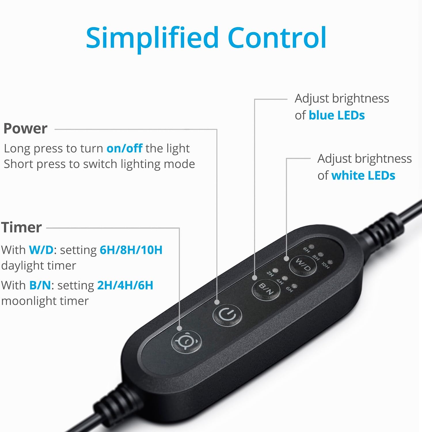 Designed for maintaining a thriving and vibrant live aquatic plants, intensity adjustable white lighting channel and blue lighting channel for customized aquarium requirement