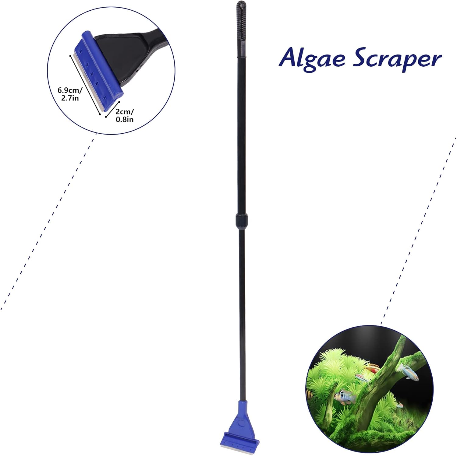 Telescopic Handle: 1.8ft to 2.6ft length, helping you reach every corner in the fish tank and clean hard-to-reach angles with ease.