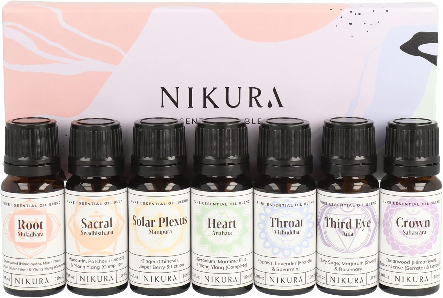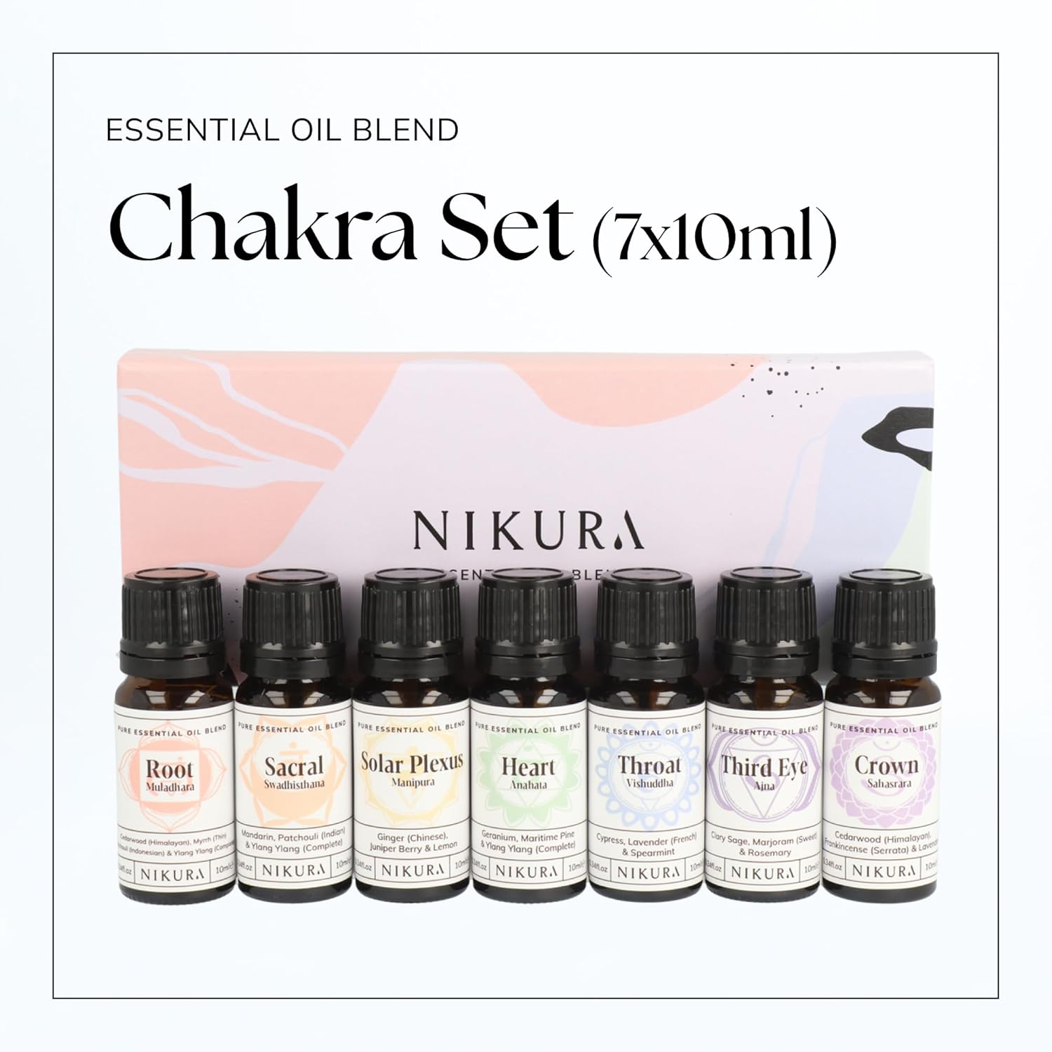 Nikura Chakra Blends Essential Oil Set | Spiritual Gifts, Meditation, Yoga Oil, Diffuser for Home, Candles | Root, Sacral, Solar Plexus, Heart, Throat, Third Eye, Crown Chakra | 7 x 10ml | UK Made