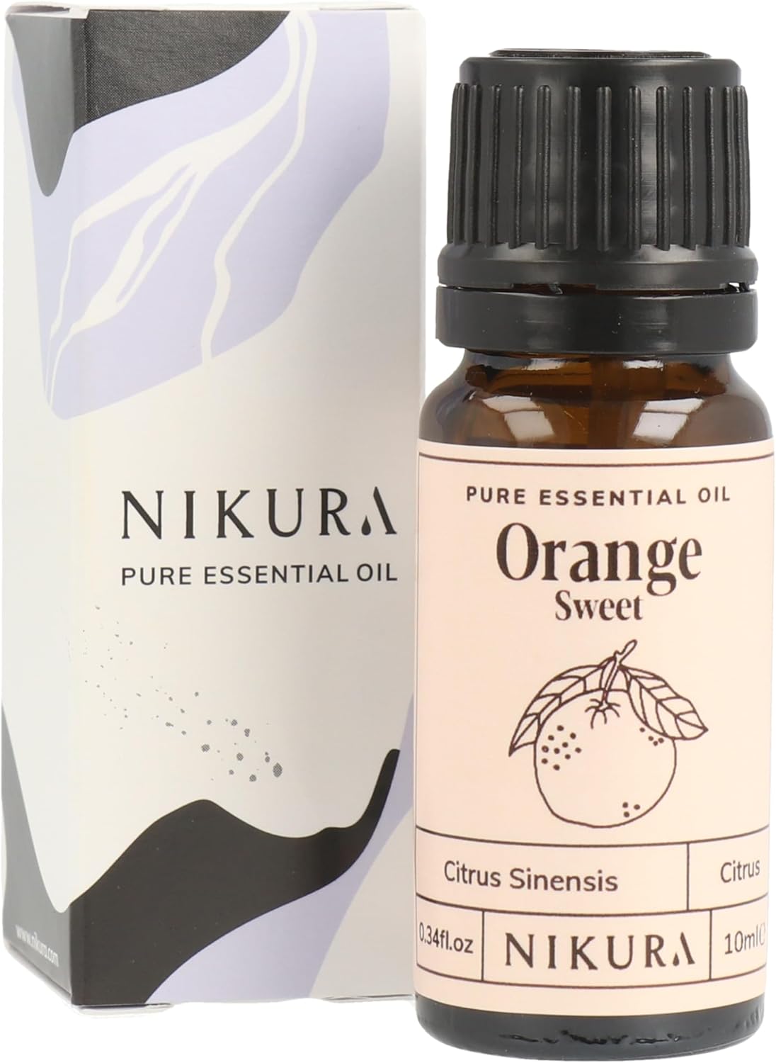 Nikura Pure Sweet Orange Essential Oil | Orange Oil for Diffusers for Home, Burner, Clean, Anxiety Relief, Mood Lifting | Great for Cleaning Spray, Skin, Soap, Candle Making | 10ml | Vegan & UK Made