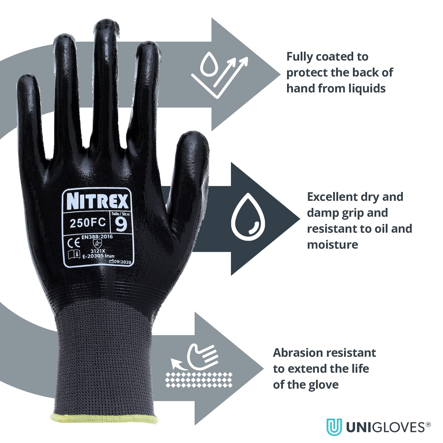 INCLUDES: 10 pairs of Unigloves Nitrex 250FC General Handling Gloves with nitrile palm coating, grey/black, size 10