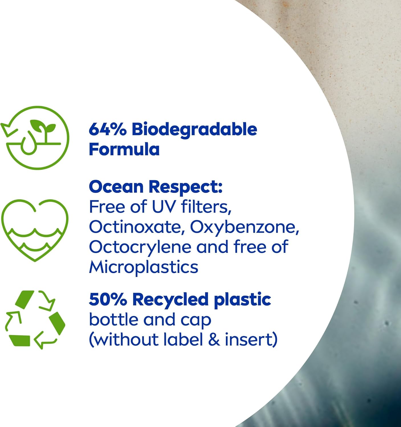 Sustainability: 64% biodegradable and respects the ocean by being free of UV Filters Octinoxate, Oxybenzone and Octocrylene and microplastic-free. The tube and cap are made from 50% recycled plastic