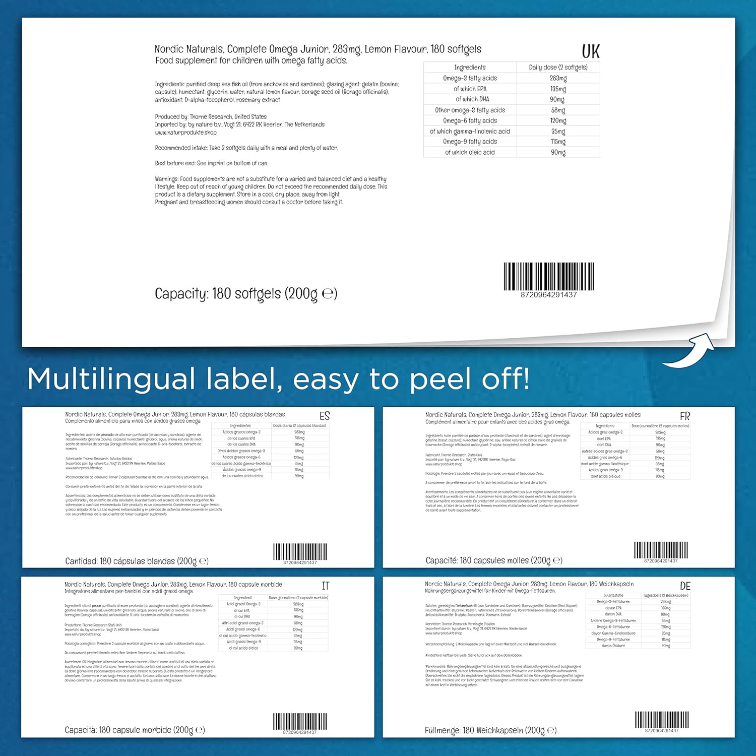 HIGH-DOSAGE: One dose, 2 softgels, Complete Omega-3 JR from Nordic Naturals contains 283mg total omega-3 and of these 135mg EPA, 90mg DHA, 58mg other omega-3, 120mg omega-6 fatty acids, of which 35mg gamma-linolenic acids and 115mg omega-9 fatty acids, of which 90mg oleic acid, which you can feed your child every day