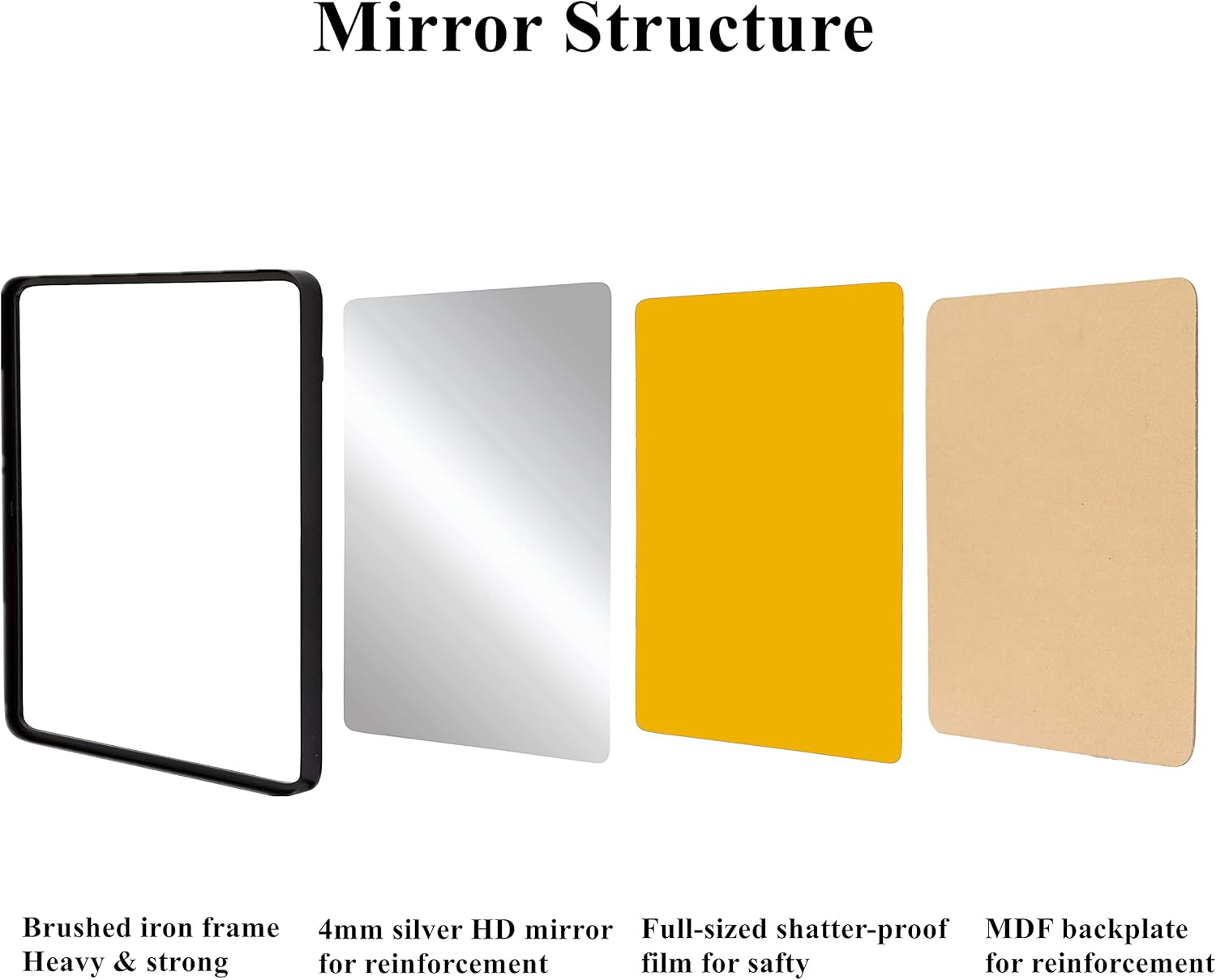 This wall-mounted mirror has 4 parts, brushed heavy & strong iron frame, clear 4mm HD silver mirror with no distortion, safe shatter-proof film and MDF backplate for reinforcement. Each part is made of high-quality material. Different from those cheap knockoffs.