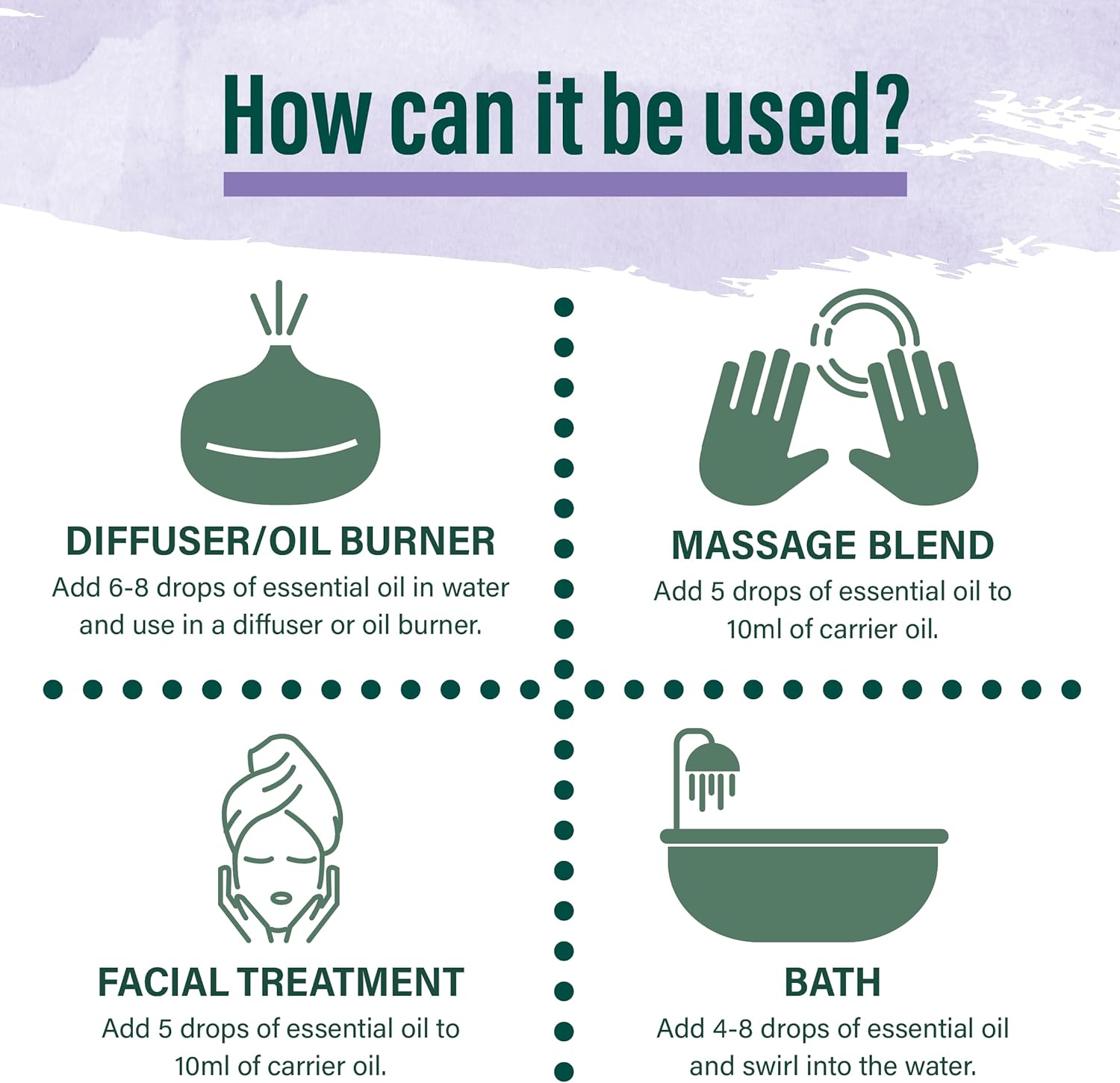 DIFFUSE OR MASSAGE – Use lavender oil in a diffuser or oil burner to provide a mental calm and offer stress relief. Alternatively, blend with a carrier oil to moisturise dry skin or massage in to help relieve muscle aches and pains.