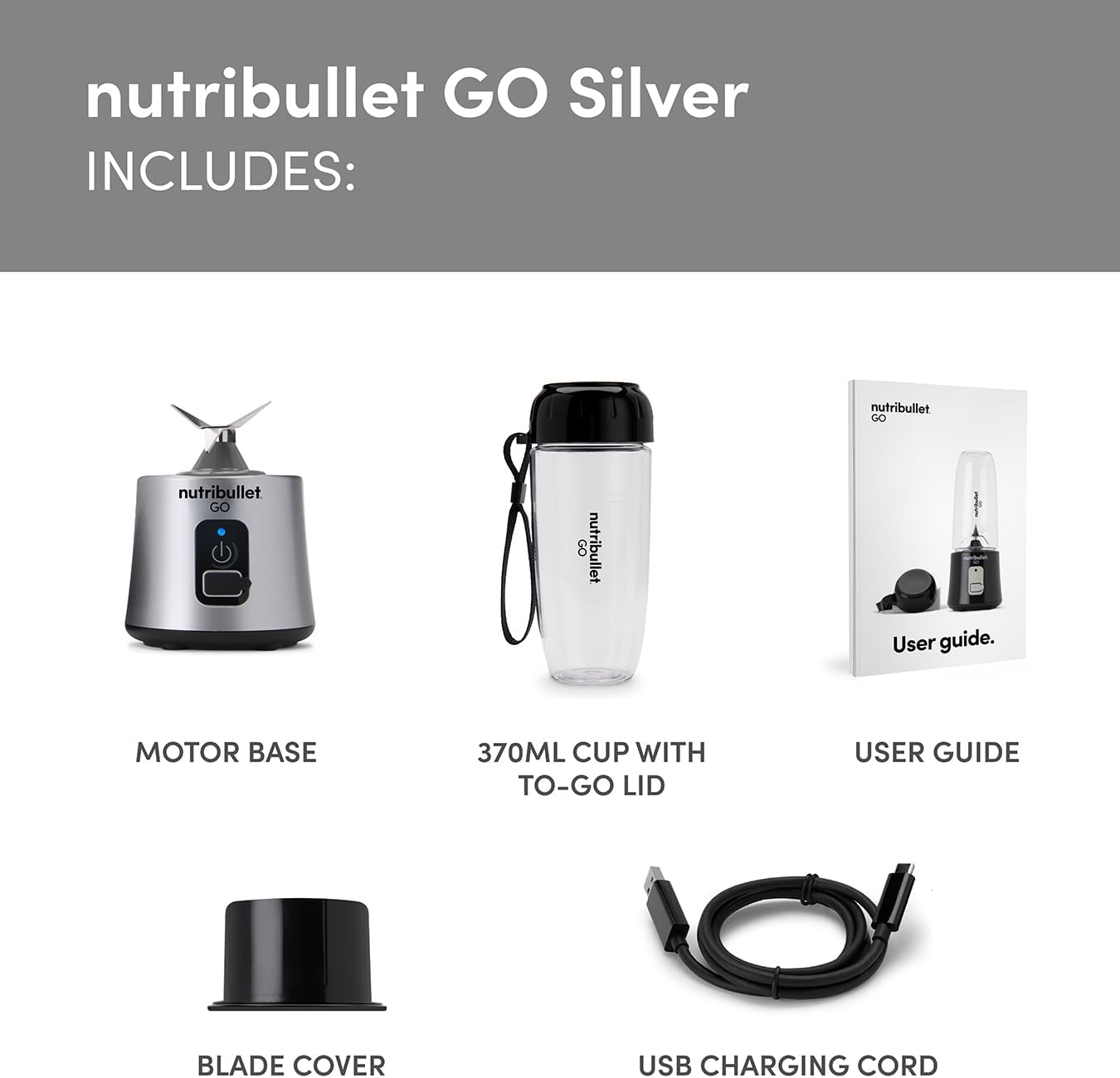 nutribullet Go Cordless Portable Blender – Silver – 70W – Powerful Extraction with 20 Blending Cycles – 18,000 RPM – Portable, Rechargeable & Lightweight – Protein Shakes & Smoothies – 370ml Cup
