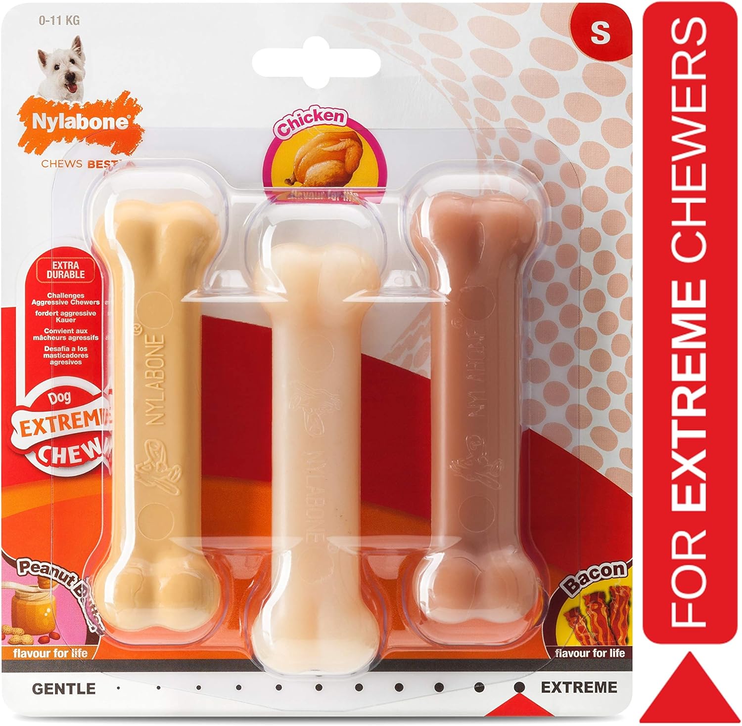 Nylabone Extreme Tough Dog Chew Toy Bones, Peanut Butter, Chicken, Bacon Flavoured, 3-Piece, Small, For Dogs Up To 11 kg