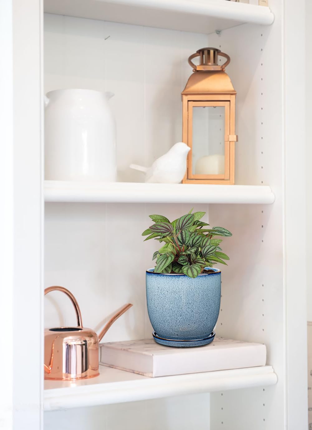 Oairse Set of 2 Ceramic Plant Pots 12CM 15CM Indoor Ceramic Planter with Drainage Holes and Saucers Tray Decorative Flower Pots Blue Garden Pot for Succulent Cactus House Plants